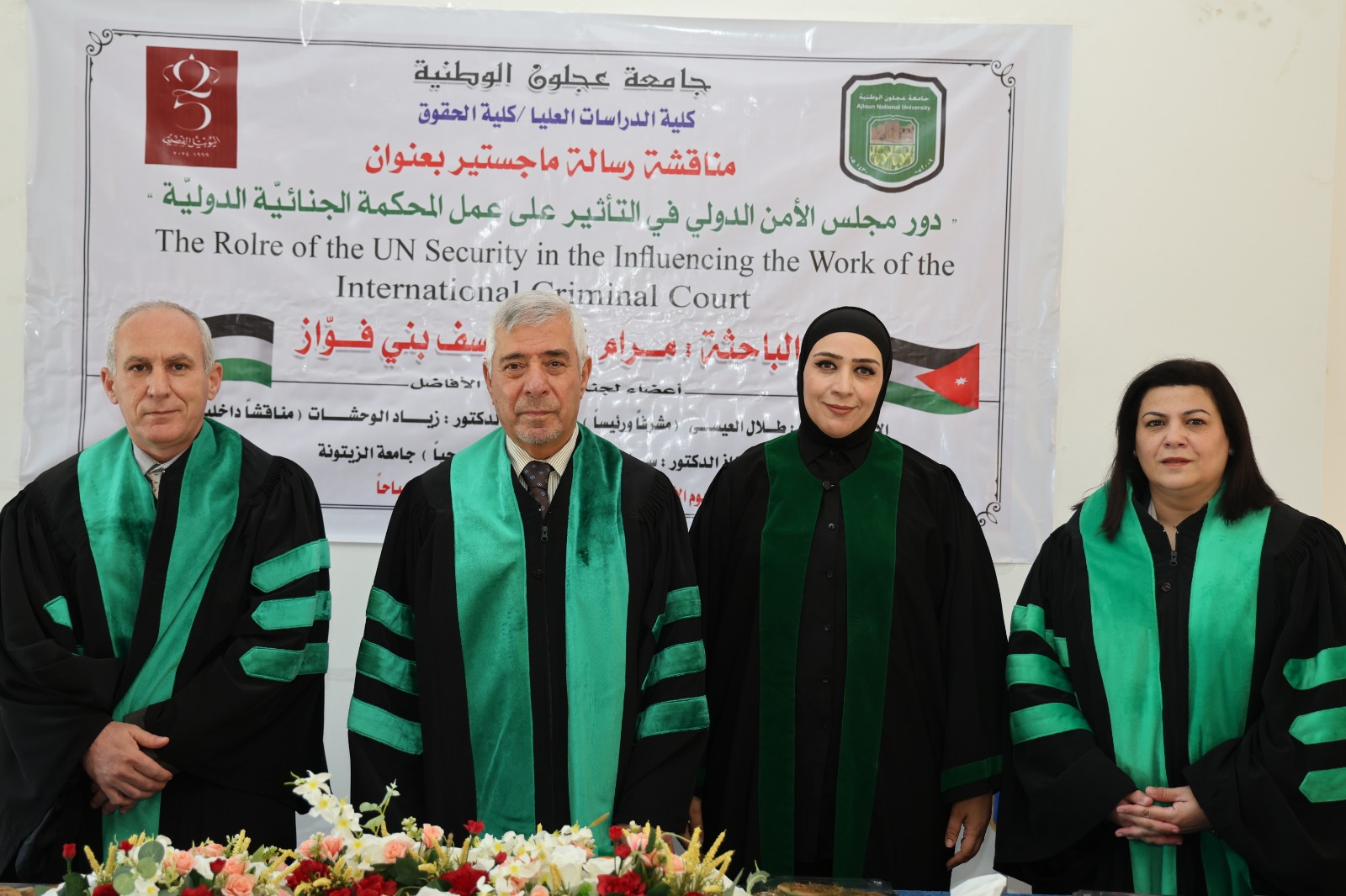 كما نوقشت اليوم في كلية الحقوق/ قسم القانون في جامعة عجلون الوطنية رسالتي ماجستير، الاولى بعنوان “دور مجلس الأمن الدولي في التأثير على عمل المحكمة الجنائية الدولية “، للطالبة مرام زكي بني فواز وبإشراف رئيسي للأستاذ الدكتور طلال العيسى، والدكتور زياد الوحشات مناقشاً داخلياً،و الأستاذ الدكتور سارة العراسي مناقشاً خارجياً من جامعة البلقاء الزيتونة.