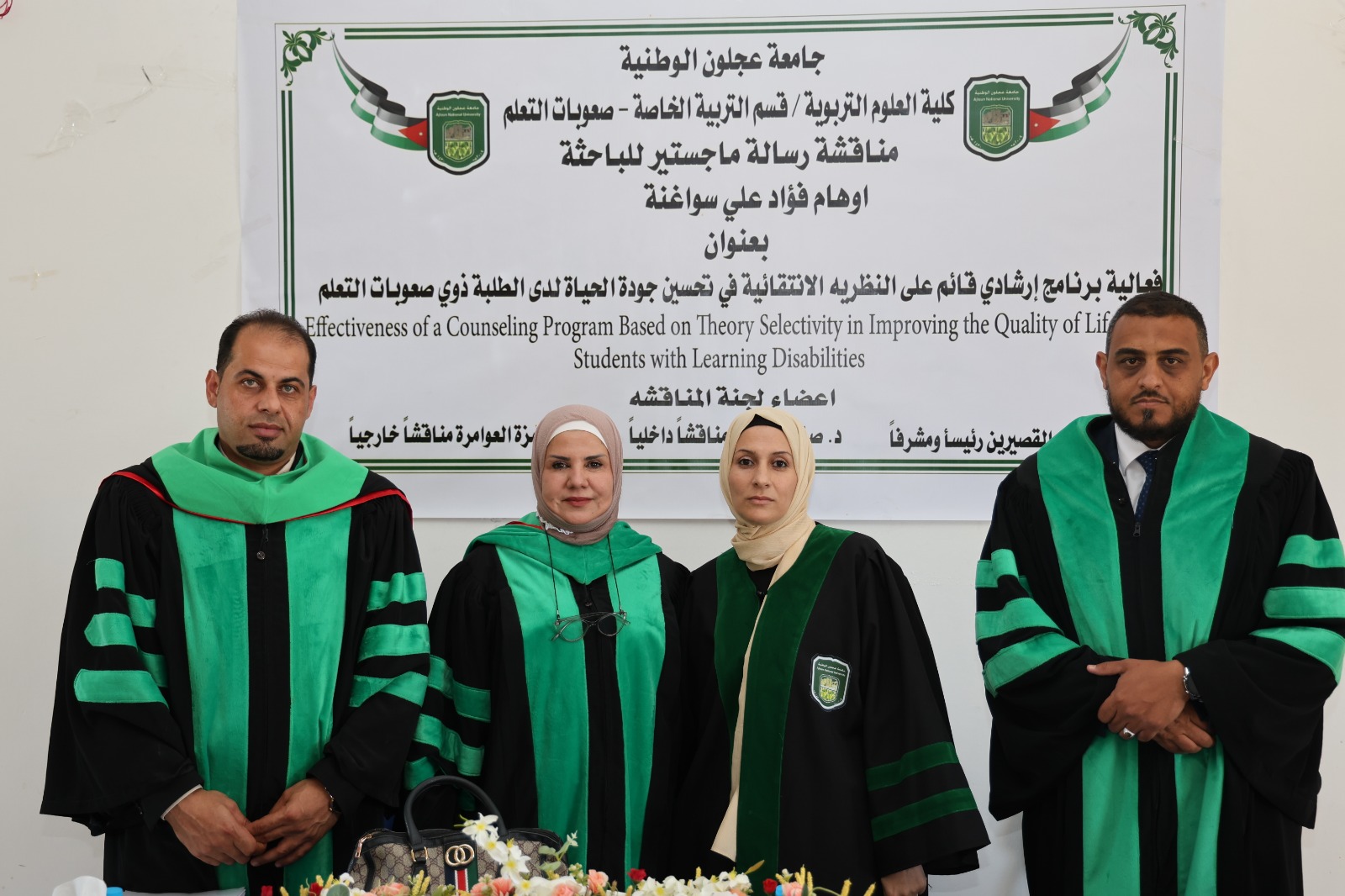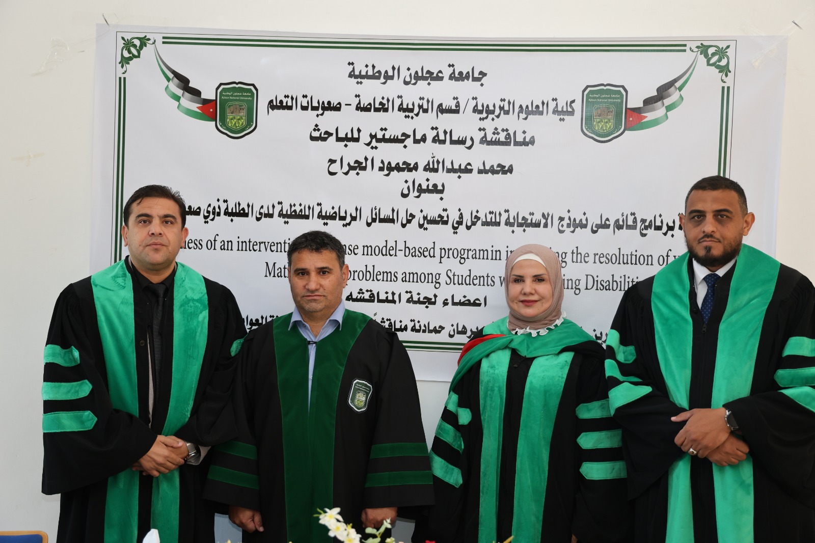 نوقشت اليوم في كلية العلوم التربوية/ قسم التربية الخاصة في جامعة عجلون الوطنية ثلاث رسائل ماجستير الأولى بعنوان ” فعالية برنامج قائم على نموذج الاستجابة للتدخل في تحسين حل مسائل الرياضية اللفظية لدى الطلبة ذوي صعوبات التعلم ” للطالب محمد عبدالله الجراح وبإشراف رئيسي للأستاذة الدكتورة الهام القصيرين، و الأستاذ الدكتور برهان الحمادنة مناقشاً داخلياً،و الدكتور حمزة العوامره مناقشاً خارجياً من جامعة العلوم الاسلامية .