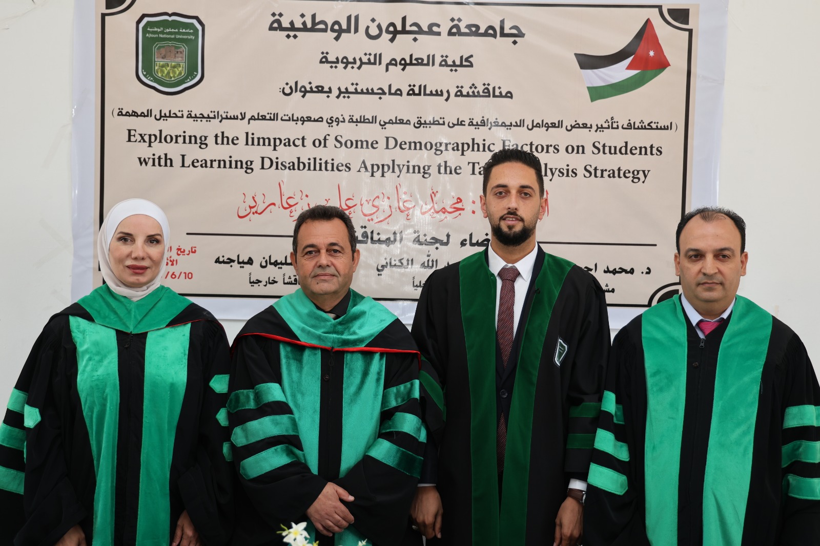 والثالثة بعنوان ” استكشاف تأثير بعض العوامل الديمغرافية على تطبيق معلمي الطلبة ذوي صعوبات التعلم لاستراتيجية تحليل المهمة” للطالب محمد غازي زعارير وبإشراف رئيسي للدكتور محمد العمري، والدكتورة ريم الكناني مناقشاً داخلياً،و الدكتور وليد هياجنة مناقشاً خارجياً من جامعة البلقاء التطبيقية .