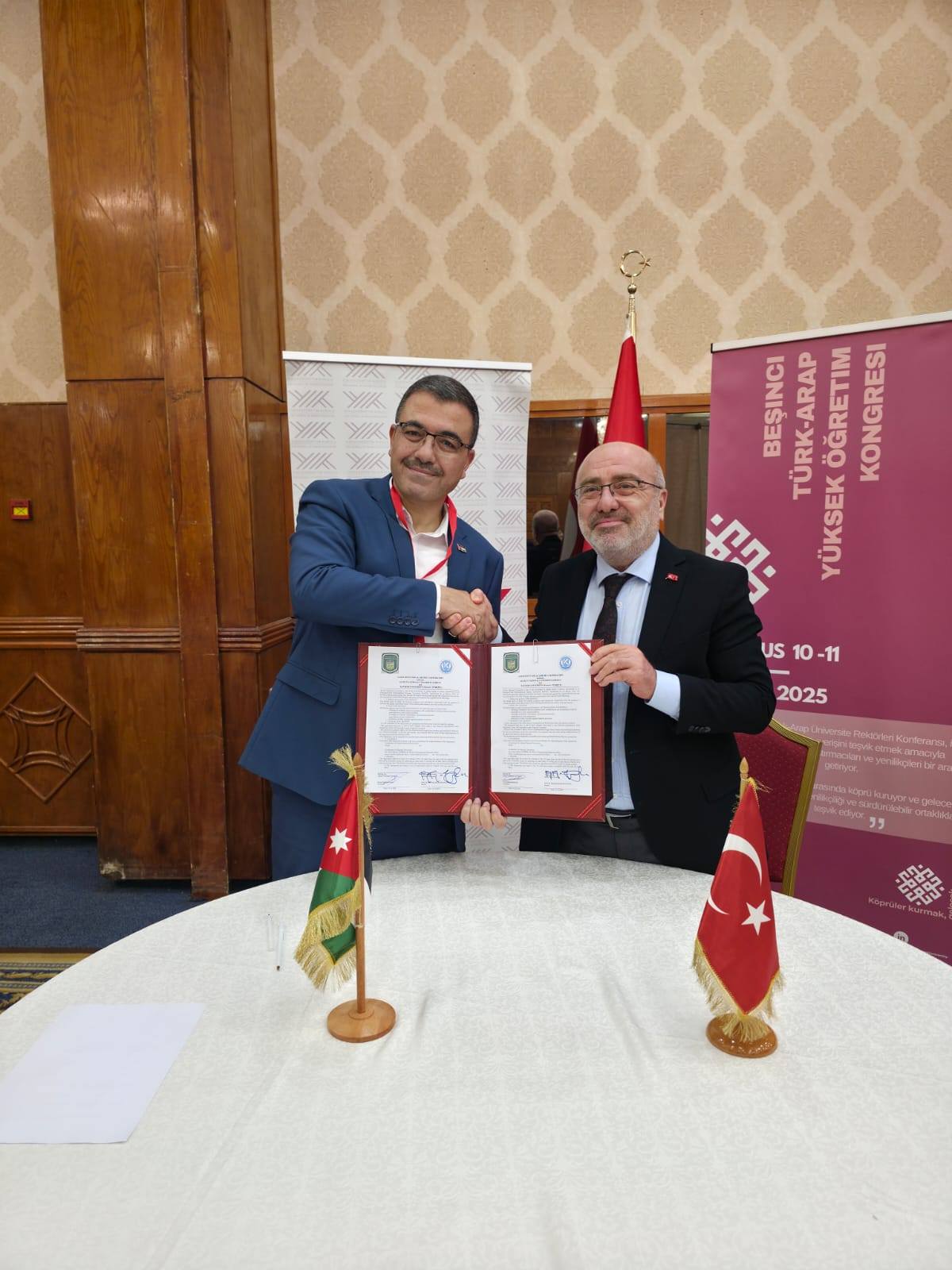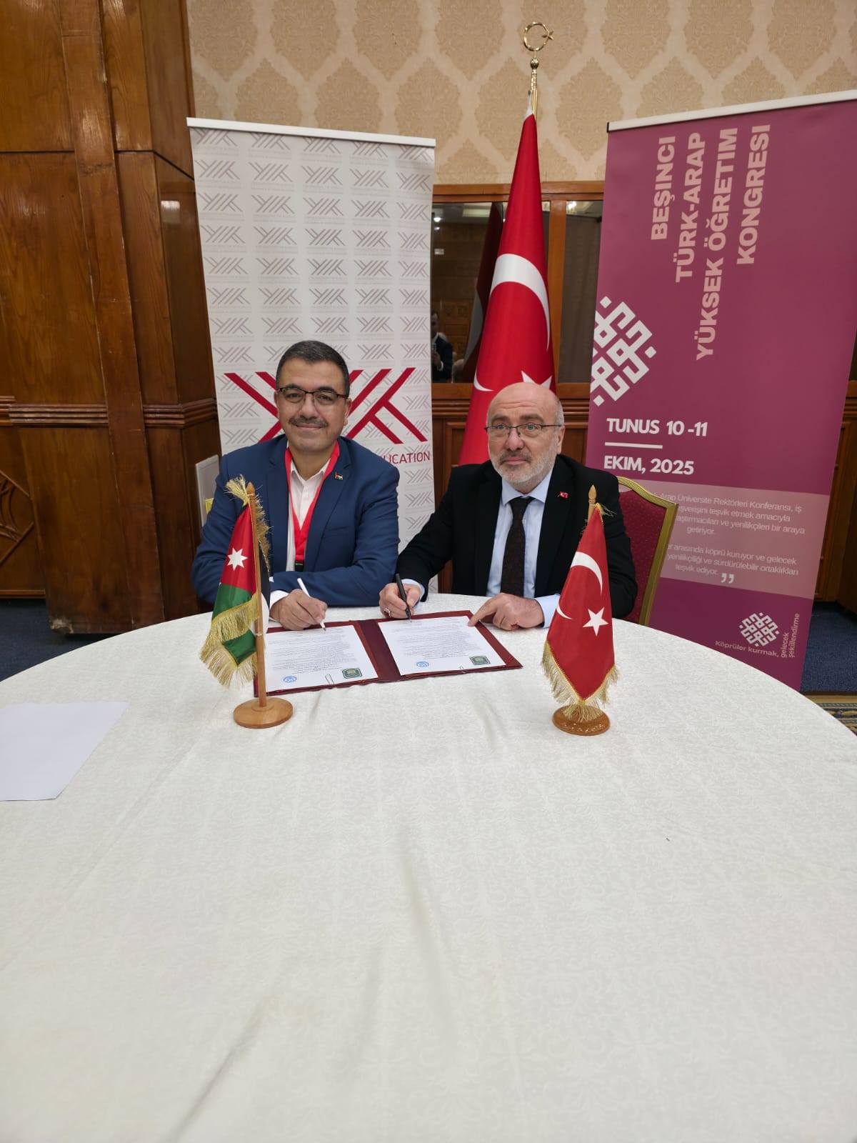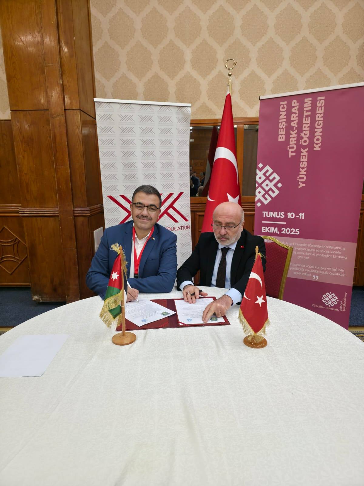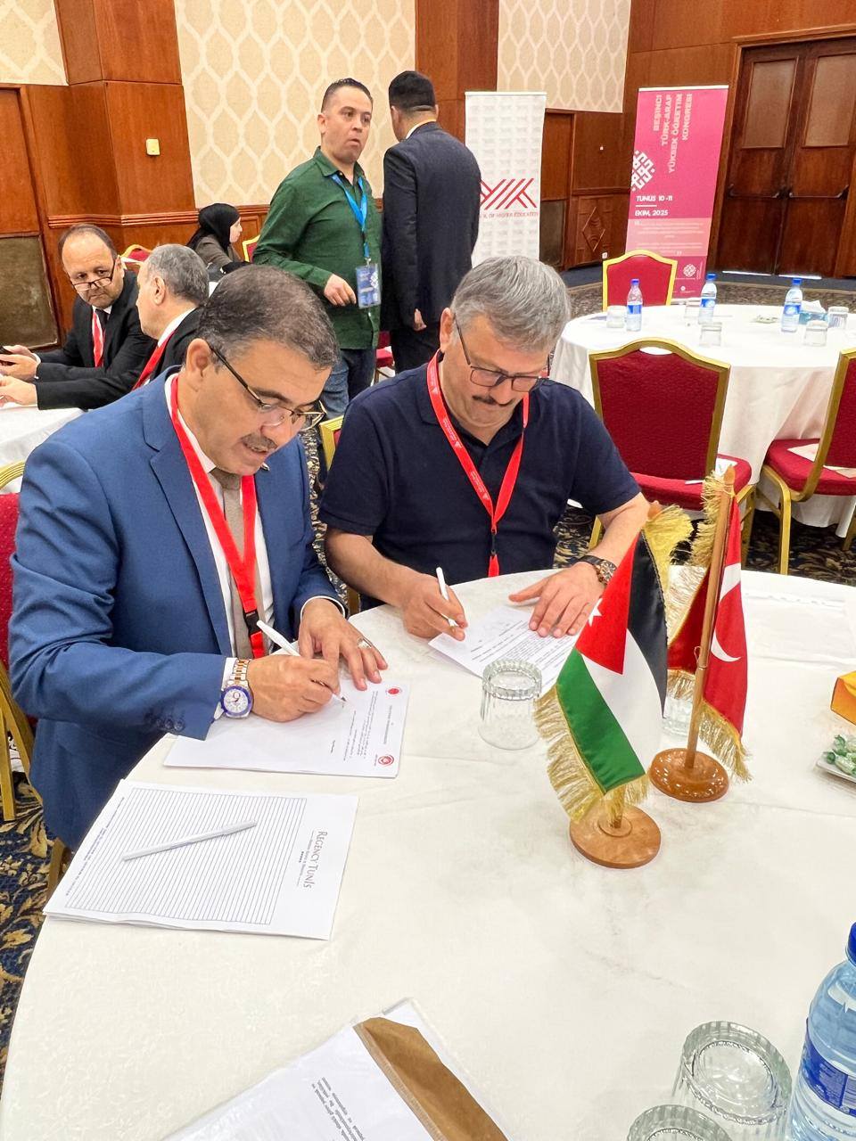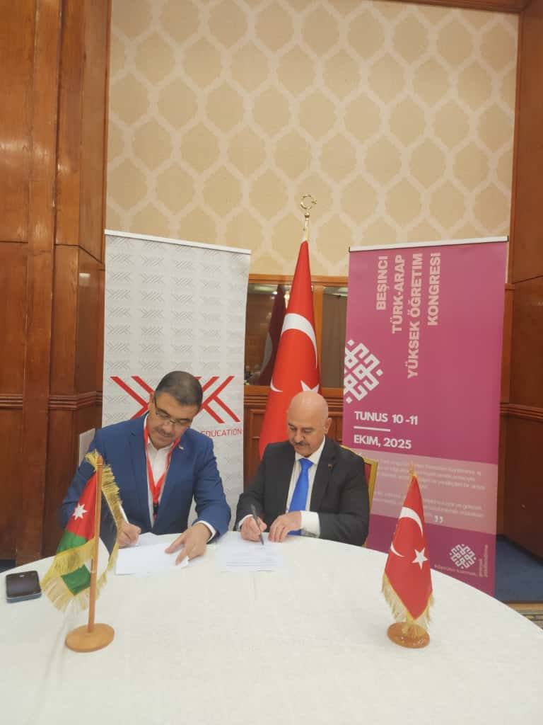 في إطار تعزيز العلاقات الأكاديمية وتطوير التعاون الدولي في مجالات التعليم العالي والبحث العلمي، وقّع رئيس جامعة عجلون الوطنية، ومدير مركز الذكاء الاصطناعي والتحول الرقمي التابع لاتحاد الجامعات العربية، الأستاذ الدكتور فراس الهناندة ، عددًا من مذكرات التفاهم مع جامعات تركية وتونسية، وذلك على هامش المؤتمر الخامس لرؤساء الجامعات العربية والتركية 2025، الذي استضافته جامعة تونس المنار ، والذي نظّمه اتحاد الجامعات العربية بمشاركة نخبة من رؤساء الجامعات والخبراء من مختلف الدول.