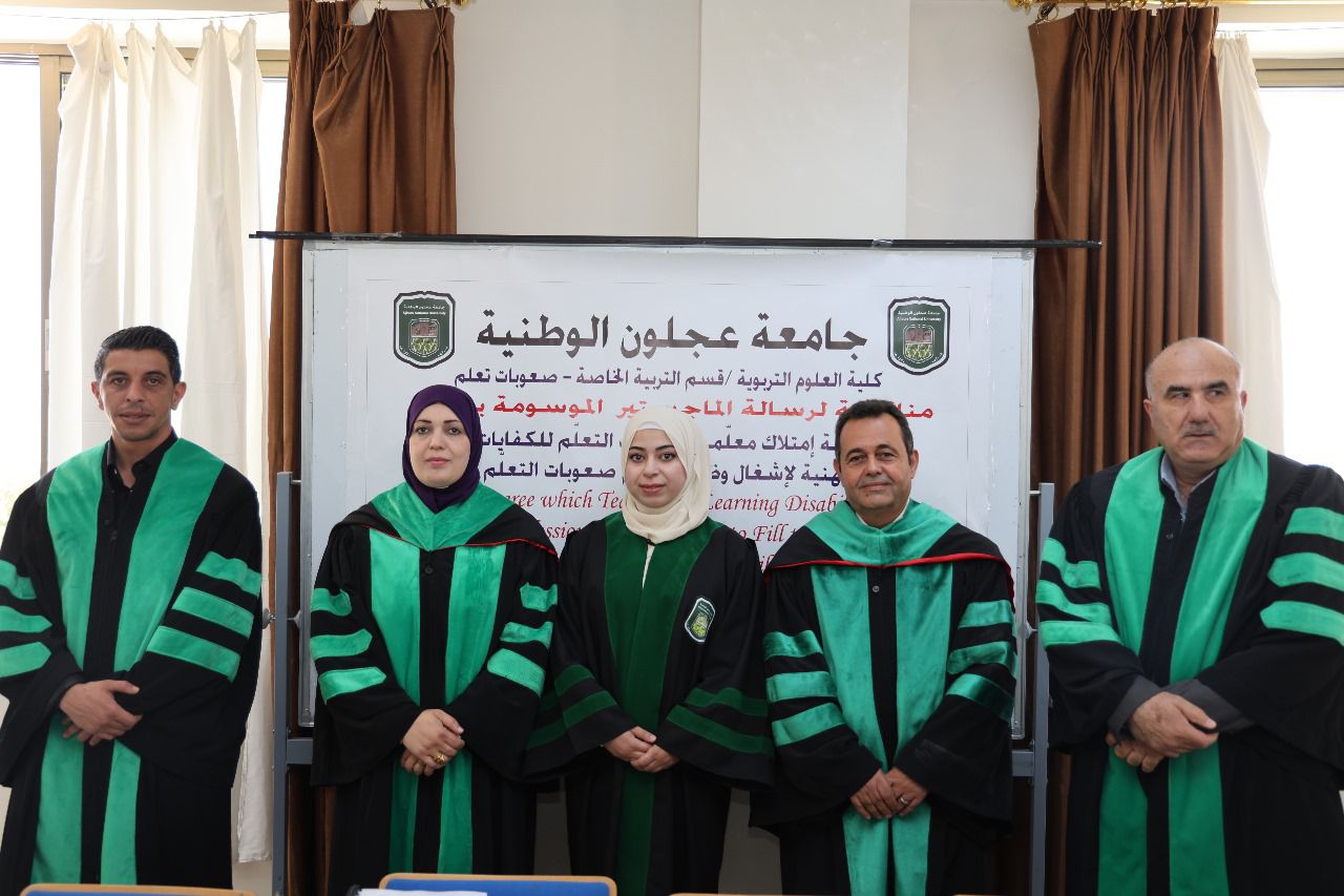 كما نوقشت اليوم في كلية العلوم التربوية / قسم التربية الخاصة – صعوبات التعلم في جامعة عجلون الوطنية رسالة ماجستير، بعنوان “درجة امتلاك معلمي صعوبات التعلم للكفايات المهنية لإشغال وظيفة معلم صعوبات التعلم “، للطالبة سارة صفوان ملكاوي وبإشراف رئيسي للدكتور محمد العمري، والدكتورة رابحة القضاة مشرفاً مشاركاً والدكتور خالد عبيدات مناقشاً داخلياً، والأستاذ الدكتور سليمان القرعان مناقشاً خارجياً من جامعة مؤتة.