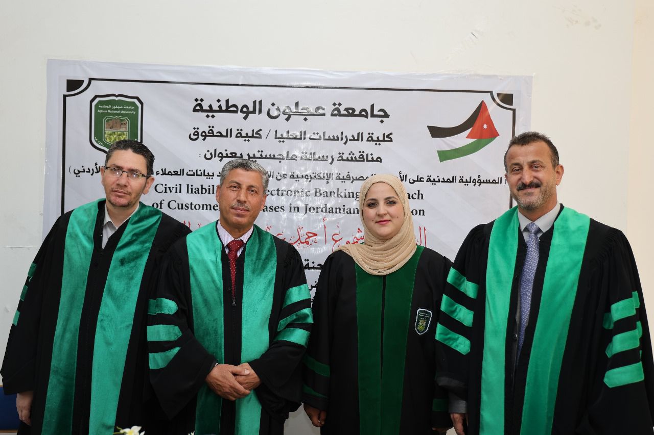 نوقشت اليوم في كلية الحقوق / قسم القانون في جامعة عجلون الوطنية ثلاث رسائل ماجستير الأولى بعنوان “المسؤولية المدنية عن الأعمال المصرفية الإلكترونية عن الإخلال بقواعد بيانات العملاء في التشريع الأردني”، للطالبة شموع أحمد الديك وبإشراف رئيسي للدكتور عيسى الصمادي، والدكتور محمد فريحات مناقشاً داخلياً، والدكتور منير هليل مناقشاً خارجياً من جامعة العلوم الاسلامية .