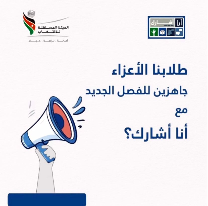 يسرنا أن نعلن عن فتح باب التسجيل للفصل الدراسي الأول 2024-2025 للبرامج التدريبية لدى برنامج أنا أشارك – جامعات/ الهيئة المستقلة للانتخاب. يهدف البرنامج إلى بناء قدرات ومهارات الطلبة الحوارية وتعزيز مشاركة الشباب السياسية والديمقراطية وصناعة القرار وذلك من خلال توفير مساحة حوارية فاعلة و آمنة، حيث ينخرط الطلبة المشاركون في جلسات حوارية خلال الفصل الدراسي بواقع جلسة مدتها ساعة واحدة. من خلال مراحله الثلاث؛ أنا أشارك، وأشارك+، والزمالة.