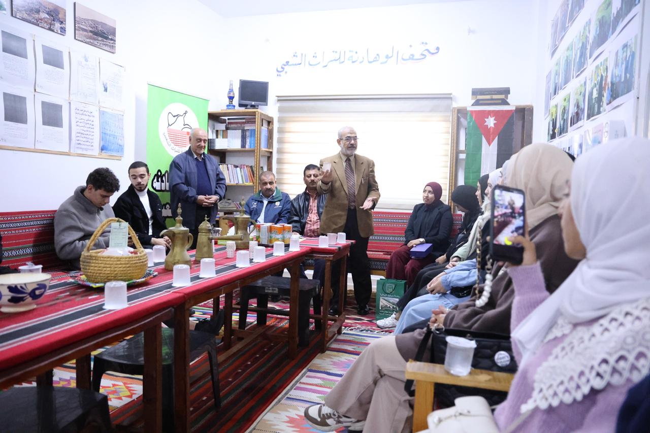 واستقبل الطلبة رئيس جمعية الوهادنة للتراث الشعبي ومؤسس المتحف الباحث محمود الشريدة، وقد لهم نبذة عن تأسيس المتحف ومقتنياته التراثية، والتي تنوف عن (1200) قطعه تراثية استخدمها الآباء والأجداد في مختلف مناحي حياتهم، كما بين لهم الغاية من إنشاء المتحف ومفهوم التراث في حياة الشعوب.