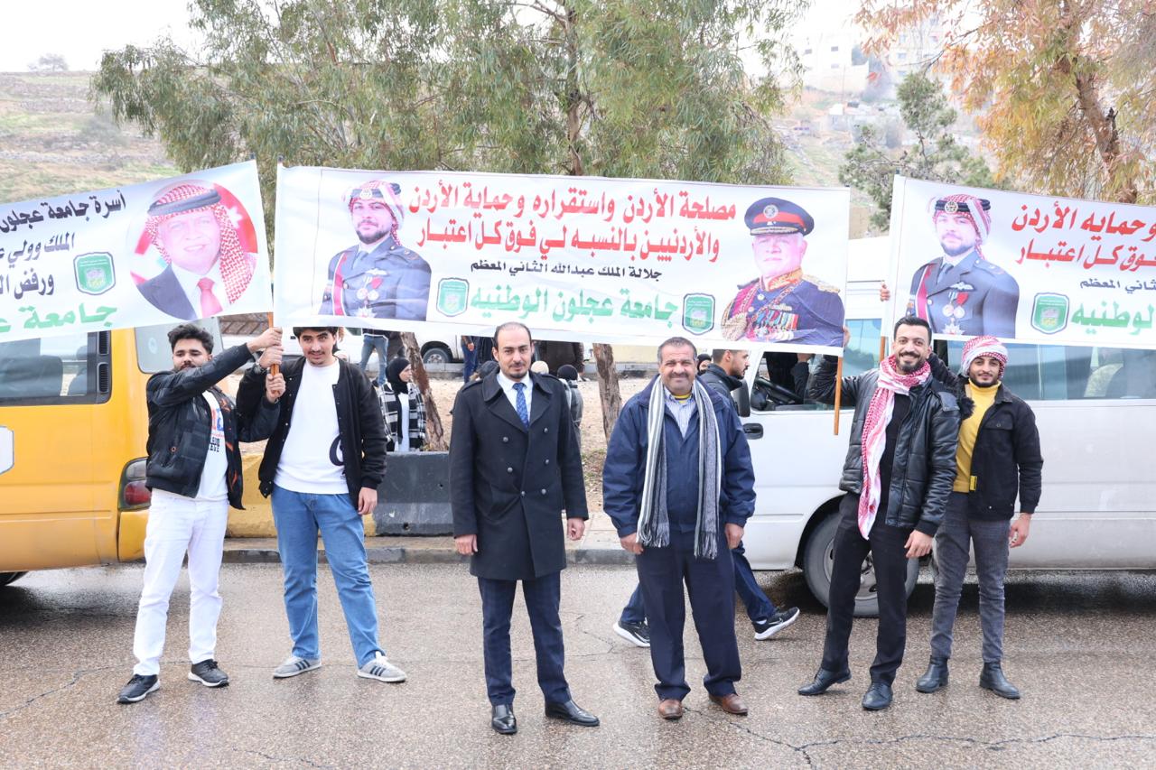 شاركت جامعة عجلون الوطنية، ممثلة بمساعد عميد شؤون الطلبة الدكتور سليم العسولي، إلى جانب عدد من أعضاء الهيئتين التدريسية والإدارية وطلبة الجامعة، في الفعاليات الوطنية التي أُقيمت لاستقبال جلالة الملك عبدالله الثاني وولي عهده الأمين الأمير الحسين بن عبدالله، بمناسبة عودتهما من الولايات المتحدة الأمريكية، وذلك في مطار ماركا العسكري.