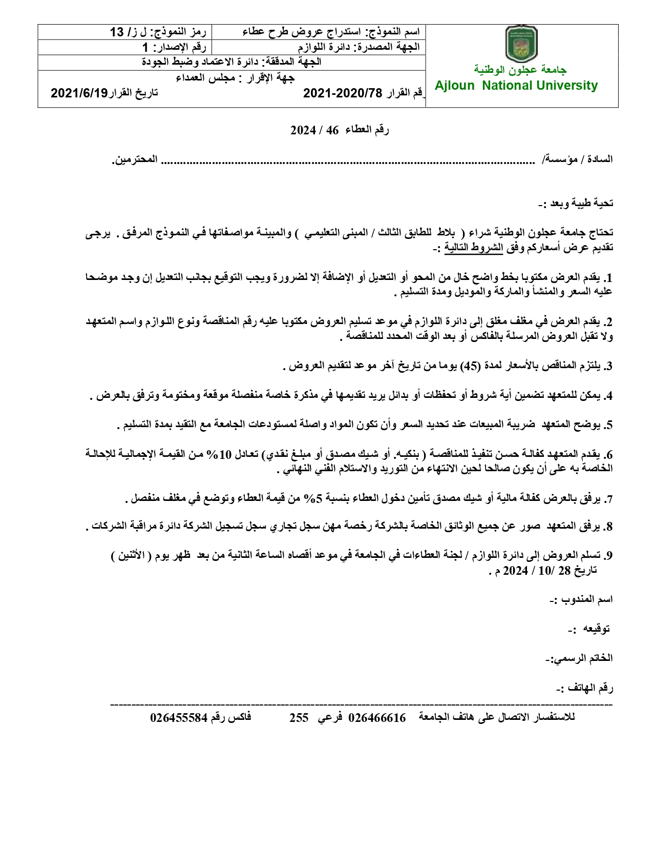 اعلان عطاء /شراء ( بلاط للطابق الثالث / المبنى التعليمي )