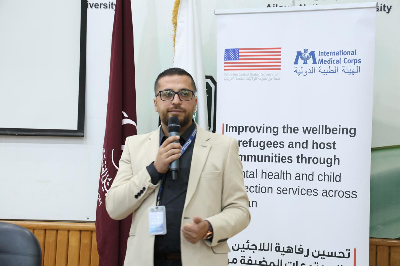وقدم الأستاذ معاذ خطاطبة مدير حالات الصحة النفسية موجزاً عن الهيئة الطبية الدولية وعن الخدمات التي تقدمها مثل الرعایة الصحیة والرعایة النفسیة و حمایة الطفل.