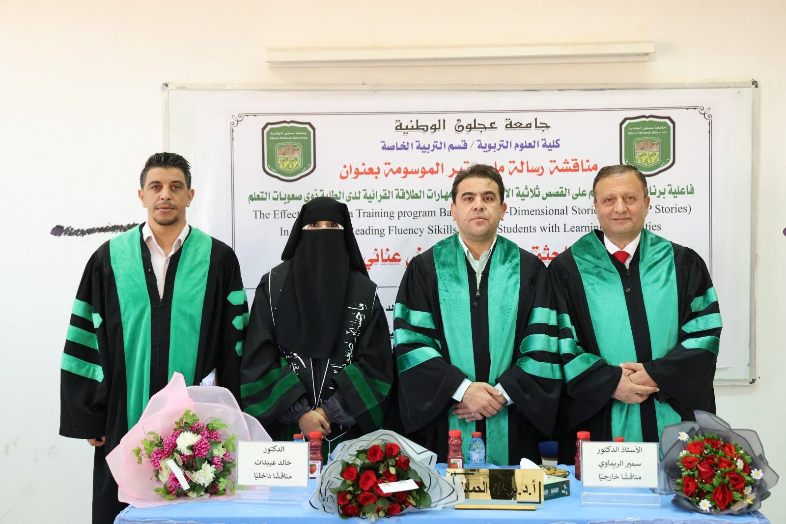 وفي كلية العلوم التربوية ناقشت الطالبة هيام قاسم عوض عناني رسالتها بعنوان “فاعلية برنامج تدريبي قائم على القصص ثلاثية الأبعاد في تنمية مهارات الطلاقة القرائية لدى الطلبة ذوي صعوبات التعلم”، بإشراف الأستاذ الدكتور برهان حمادنة، وعضوية الدكتور خالد عبيدات، والأستاذ الدكتور سمير عبد الكريم الريماوي من جامعة البلقاء التطبيقية.