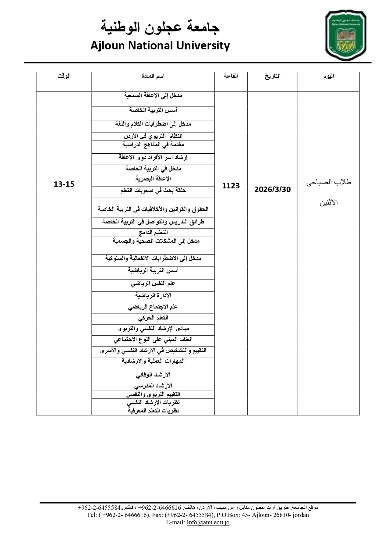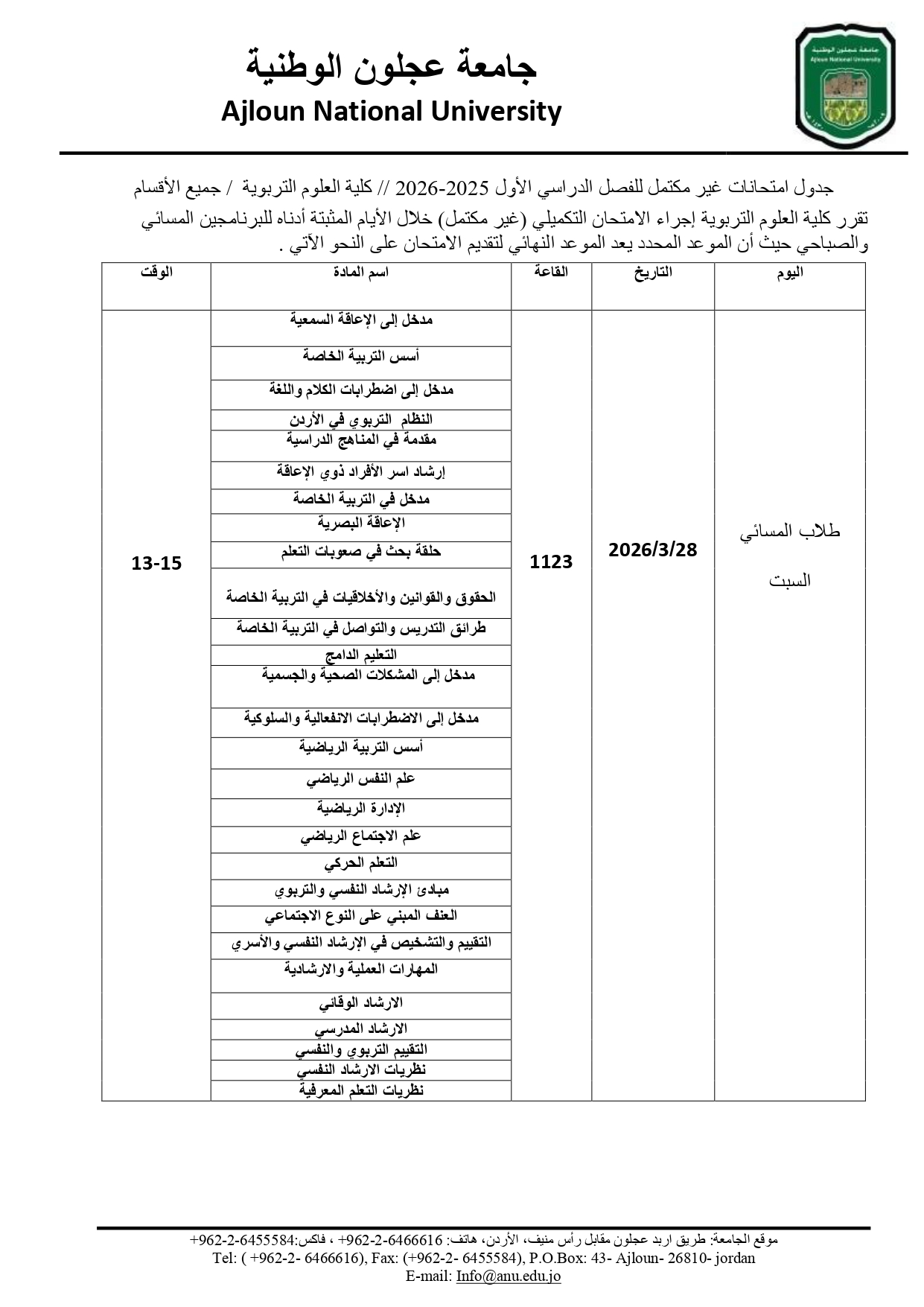 جدول امتحانات غير مكتمل للفصل الدراسي الأول 2025-2026 / كلية العلوم التربوية/ جميع الأقسام