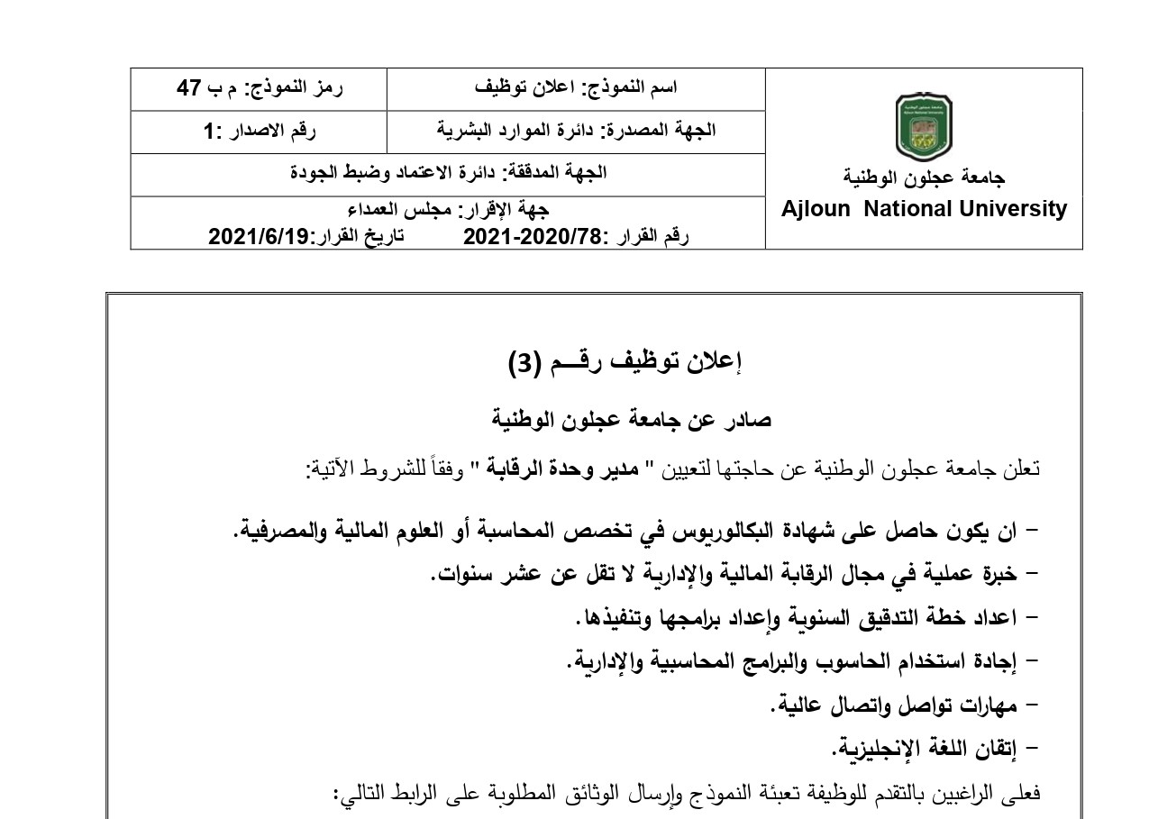 فعلى الراغبين بالتقدم للوظيفة تعبئة النموذج وإرسال الوثائق المطلوبة على الرابط التالي: https://www.anu.edu.jo/job-application/ ، اعتباراً من تاريخ 18/2/2026 ولغاية 22/2/2026 ** لن يتم قبول أي طلب في حالة عدم اكتمال الشروط والوثائق المطلوبة، وانتهاء فترة الإعلان. للاستفسار هاتف: 6466616/02 فرعي (252)