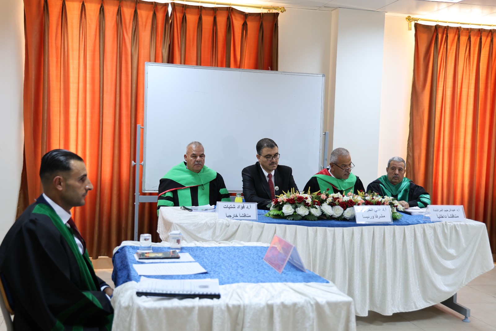 وتشكلت لجنة المناقشة من الأستاذ الدكتور علي الخرابشة مشرفاً ورئيساً، وعضوية كل من الأستاذ الدكتور عبدالرحيم المراشدة مناقشاً داخلياً، والأستاذ الدكتور فؤاد شتيات من جامعة الإسراء مناقشاً خارجياً، وحضر المناقشة عميد كلية الآداب الأستاذ الدكتور محمود الصبح، وبعض من أعضاء الهيئة التدريسية.