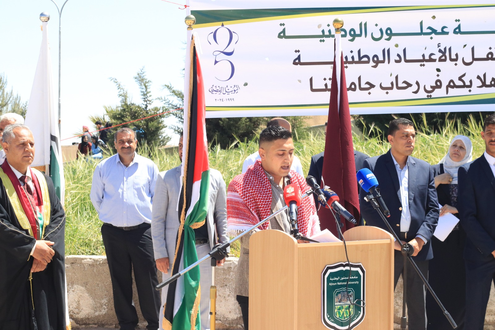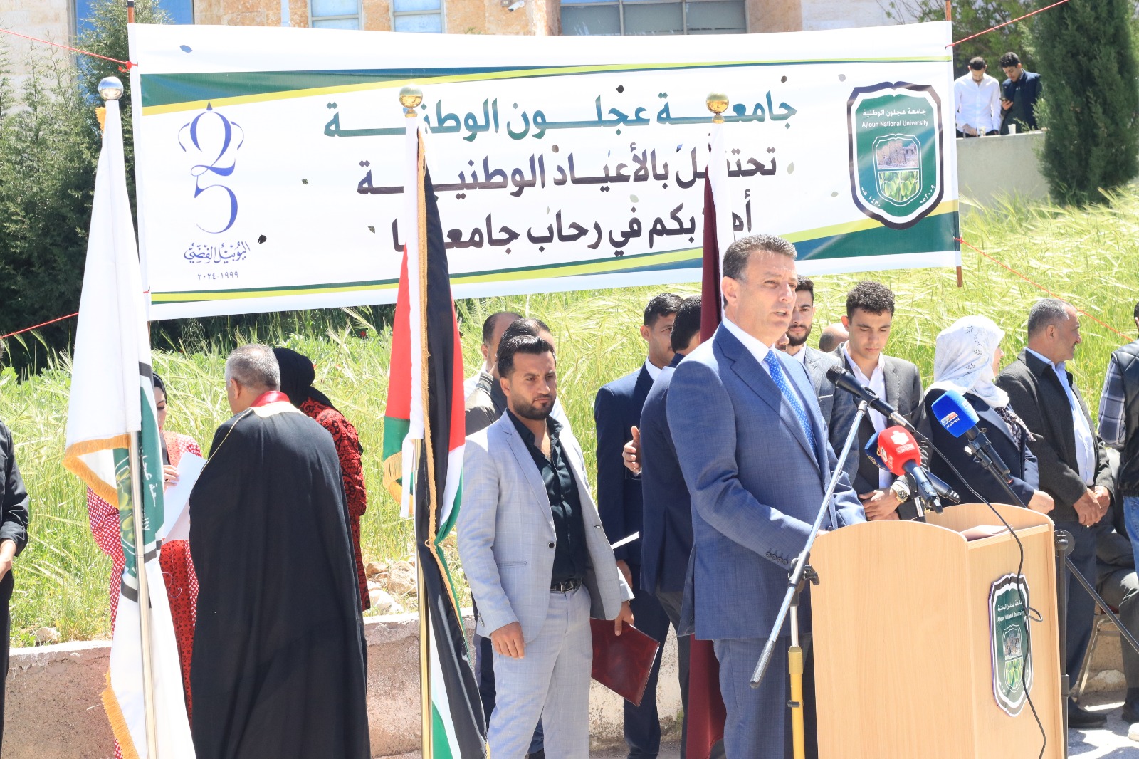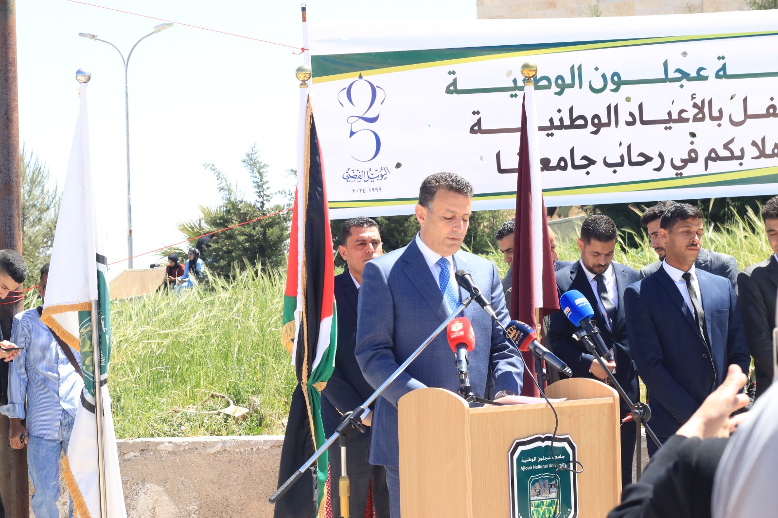 تحت رعاية رئيس مجلس النواب أحمد الصفدي احتفلت جامعة عجلون الوطنية باليوبيل الفضي بمناسبة تولي جلالة الملك عبدالله الثاني سلطاته الدستورية، ممثلة برئيسها الأستاذ الدكتور فراس الهنانده وبحضور محافظ عجلون الدكتور قبلان الشريف ورئيس مجلس أمناء الجامعة الدكتور محمد نور الصمادي، وعدد من النواب وأسرة الجامعة وطلبتها وعدد من وجهاء وأبناء المحافظة.