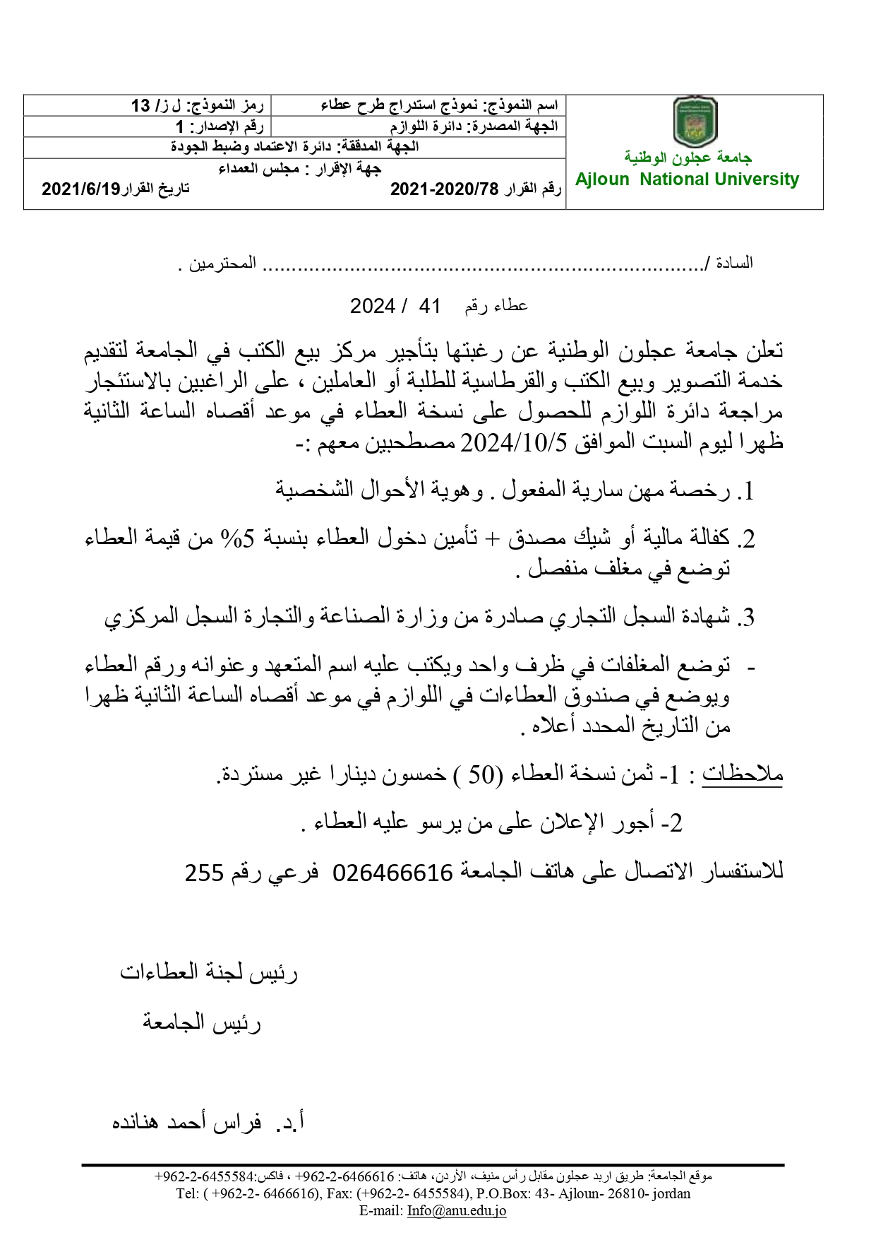 اعلان طرح عطاء /تأجير مركز بيع الكتب (Book Shop)