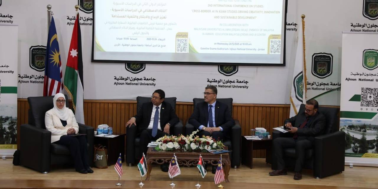 استضافت جامعة عجلون الوطنية، اليوم الأربعاء، فعاليات المؤتمر الدولي الثاني في الدراسات الآسيوية بعنوان: «الذكاء الاصطناعي في الدراسات الآسيوية – تعزيز الإبداع والابتكار والتنمية المستدامة»، برعاية كريمة من سعادة سفير مملكة ماليزيا لدى المملكة الأردنية الهاشمية داتو محمد نصري، ورئيس جامعة عجلون الوطنية الأستاذ الدكتور فراس الهناندة، وبمشاركة دبلوماسية ورسمية وأكاديمية رفيعة المستوى.