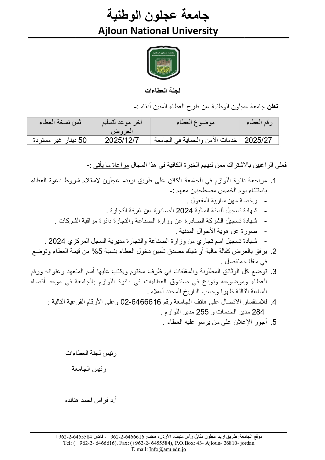 اعلان عطاء /خدمات الأمن والحماية في الجامعة