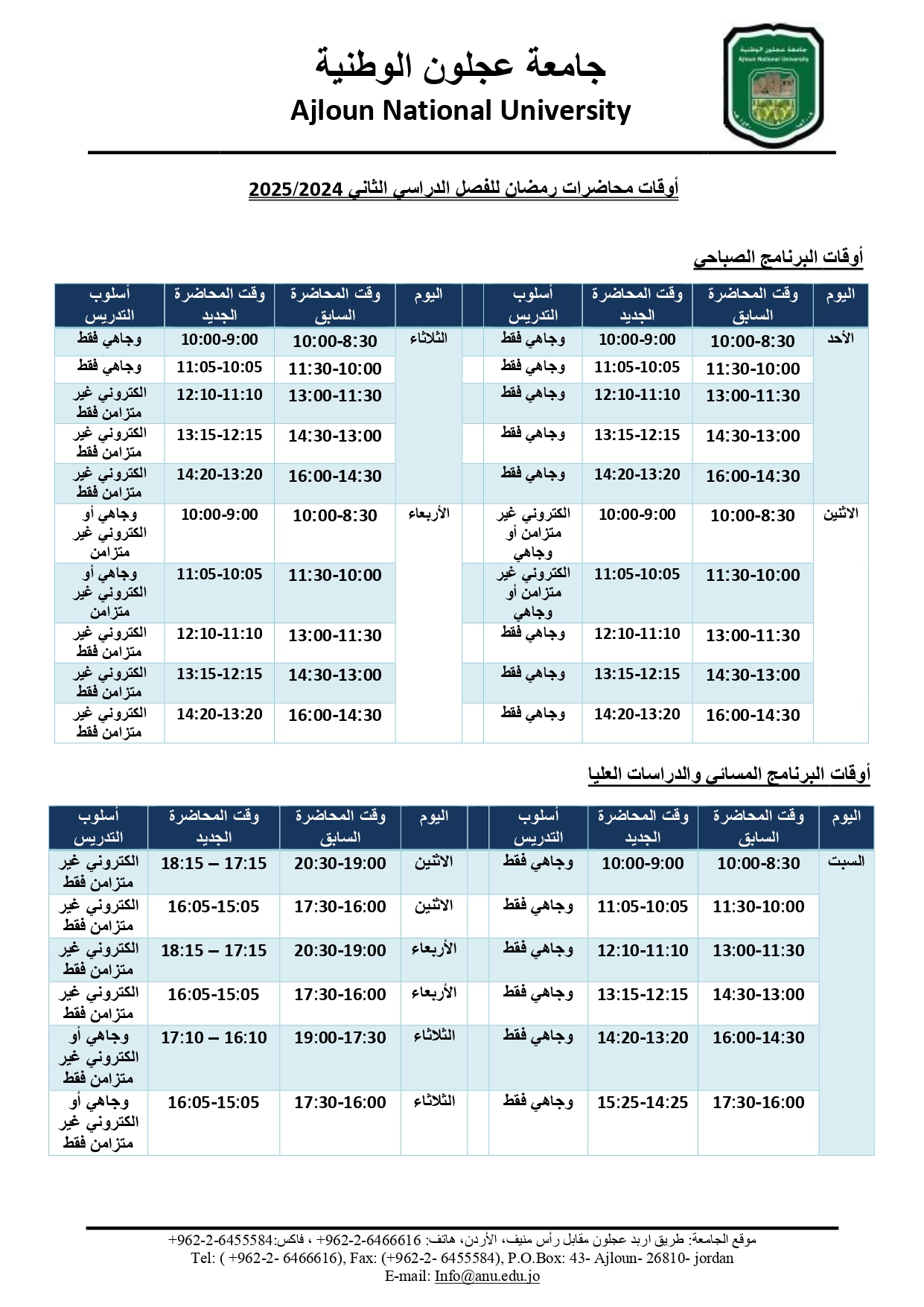 ومراعاةً لأجواء الشهر الفضيل، تم تعديل أوقات المحاضرات لتناسب الجميع، مع الحفاظ على جودة التعليم وسلاسة العملية الدراسية.