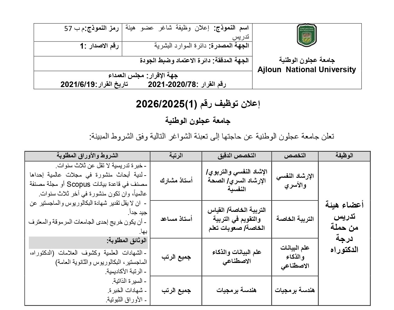 ** لن يتم قبول أي طلب في حالة عدم اكتمال الشروط والوثائق المطلوبة، وانتهاء فترة الإعلان.