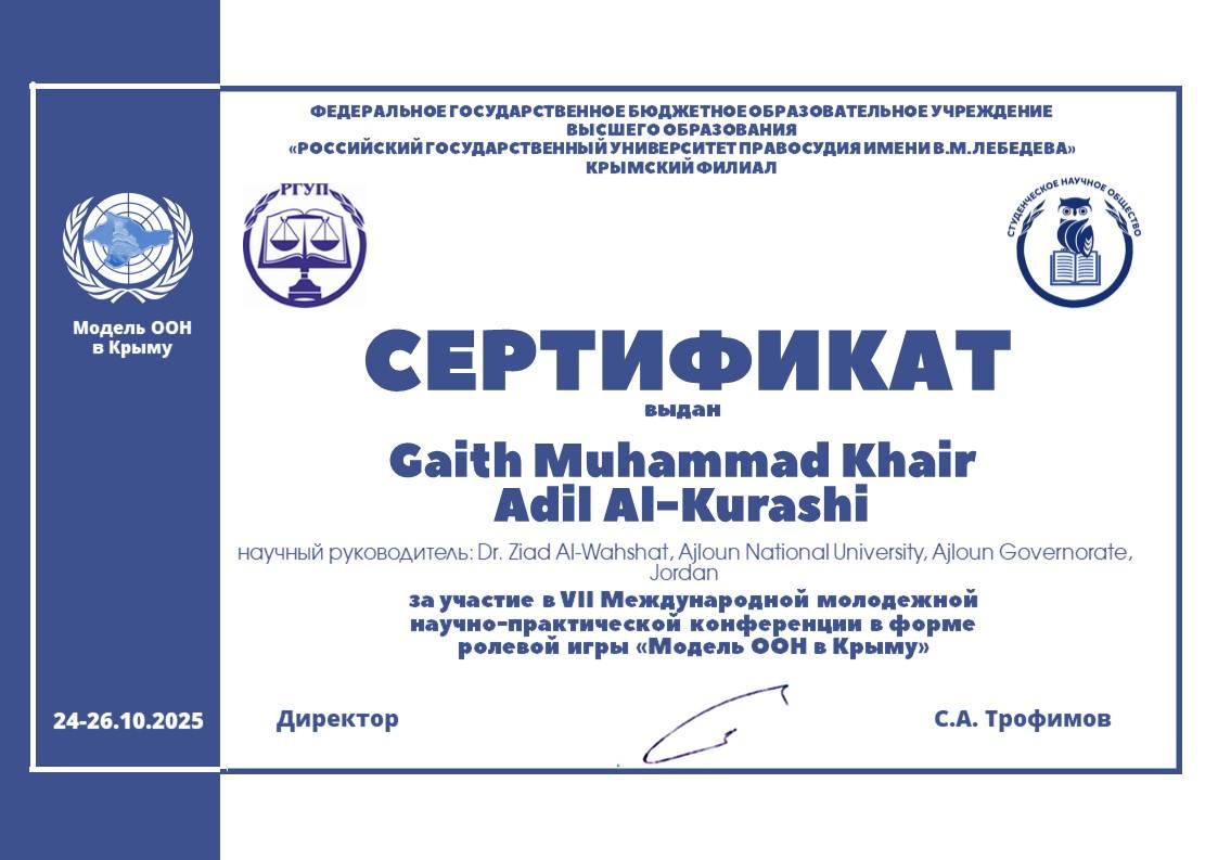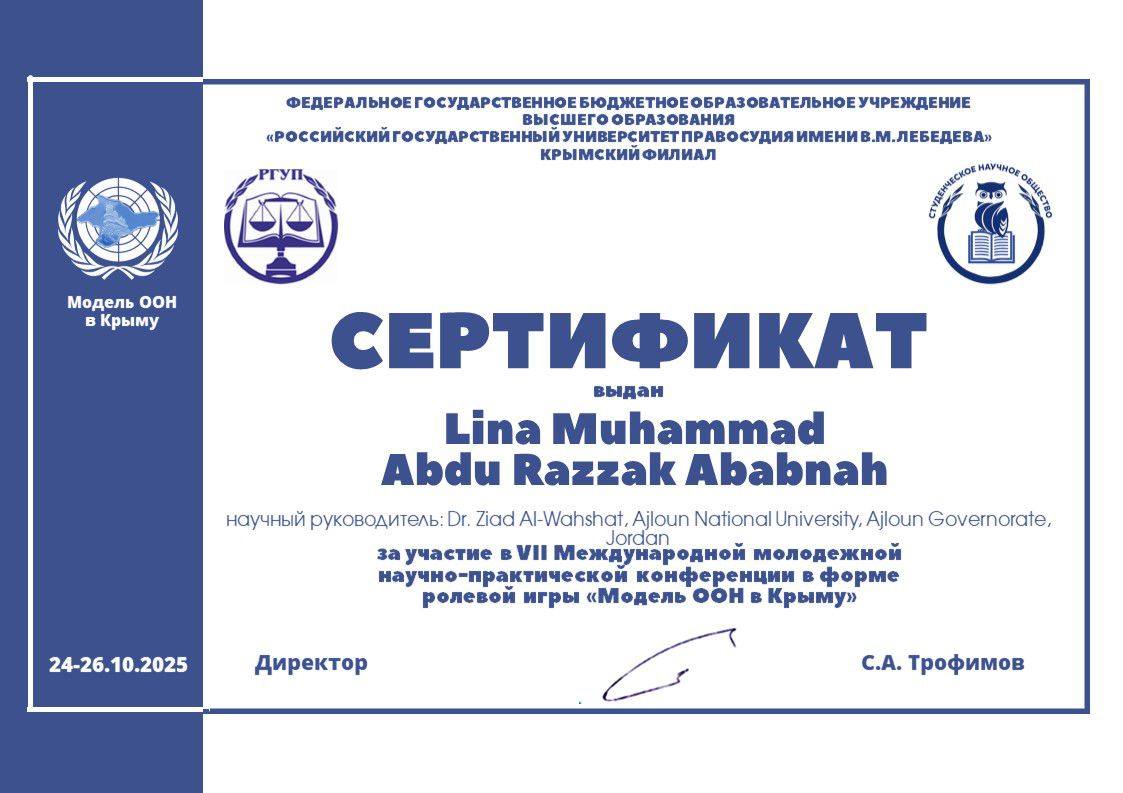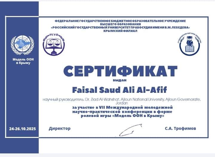 شاركت جامعة عجلون الوطنية ممثلةً بـ كلية الحقوق، وبإشراف عميد الكلية الدكتور زياد الوحشات، عن بُعد في أعمال المؤتمر الدولي السابع للشباب العلمي والعملي الذي انعقد بتاريخ 24 تشرين الأول 2025، التي نظمته جامعة العدل الروسية فرع القرم، تحت عنوان: “نحن نبني مستقبلنا معًا”، بمناسبة مرور ثمانين عامًا على تأسيس منظمة الأمم المتحدة.