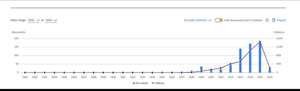 كما يوضح الرسم أن عام 2026 ما يزال في بدايته، ورغم ذلك فقد سجل حضورًا بحثيًا مبكرًا يؤكد استمرار المنحنى التصاعدي، ما يعزز التوقعات بتحقيق أرقام قياسية جديدة مع نهاية العام.