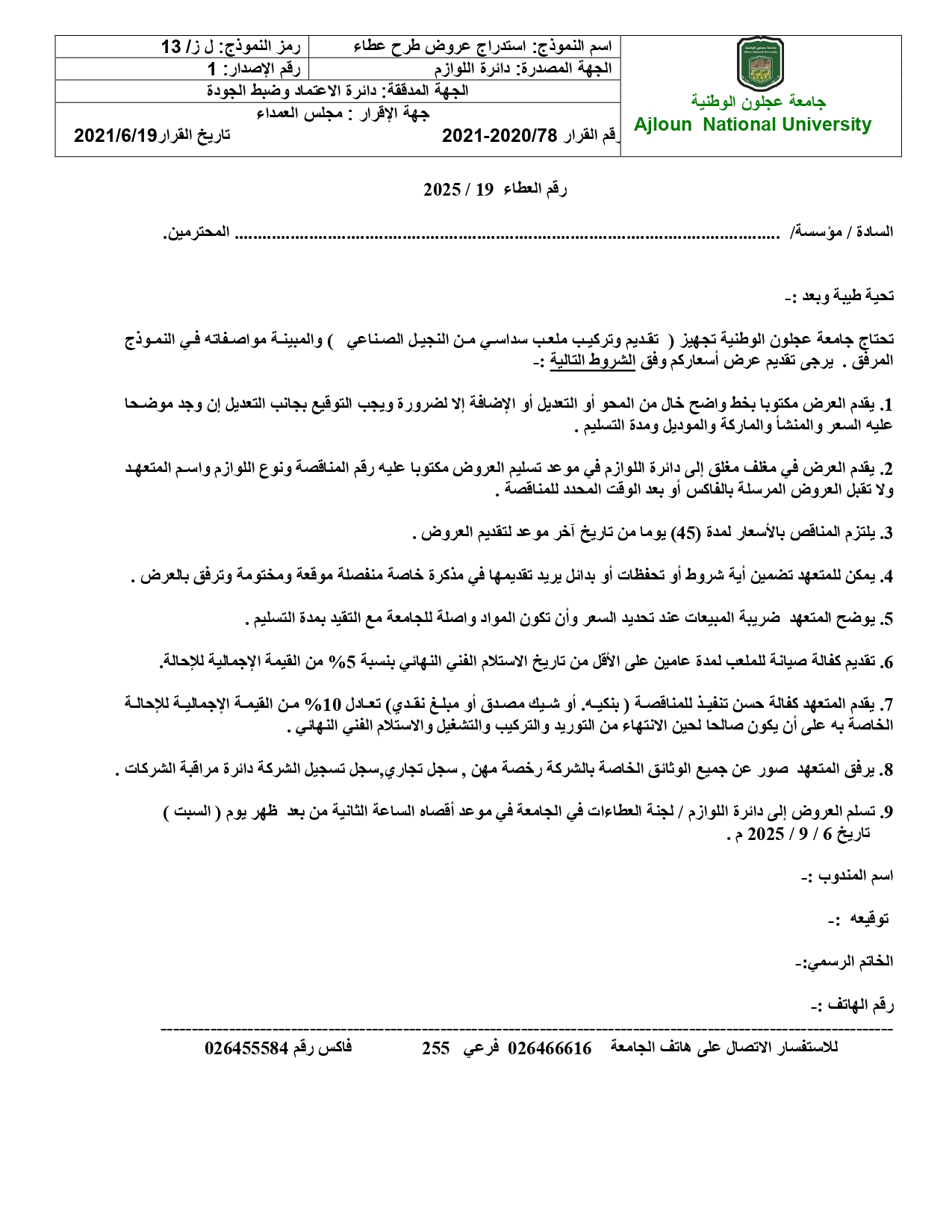 اعلان عطاء /تجهيز ( تقديم وتركيب ملعب سداسي من النجيل الصناعي )