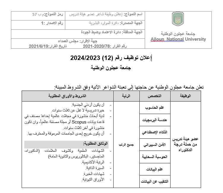 نموذج طلب توظيف عضو هيئة تدريس في جامعة عجلون الوطنية