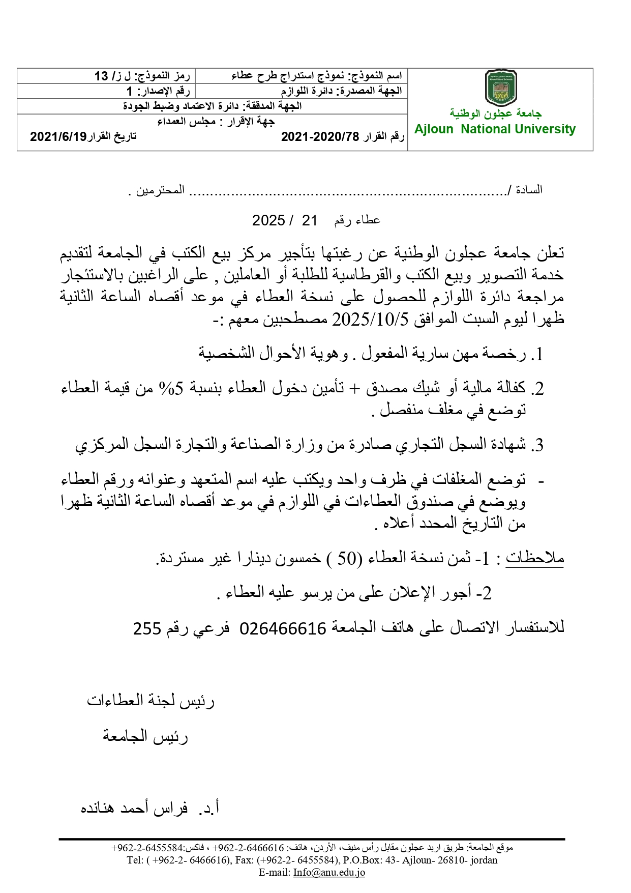 اعلان طرح عطاء /تأجير مركز بيع الكتب في الجامعة