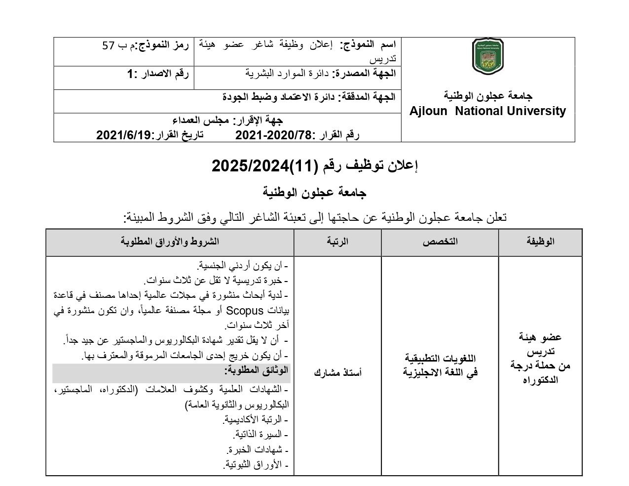 اعلان توظيف /عضو هيئة تدريس من حملة درجة الدكتوراه