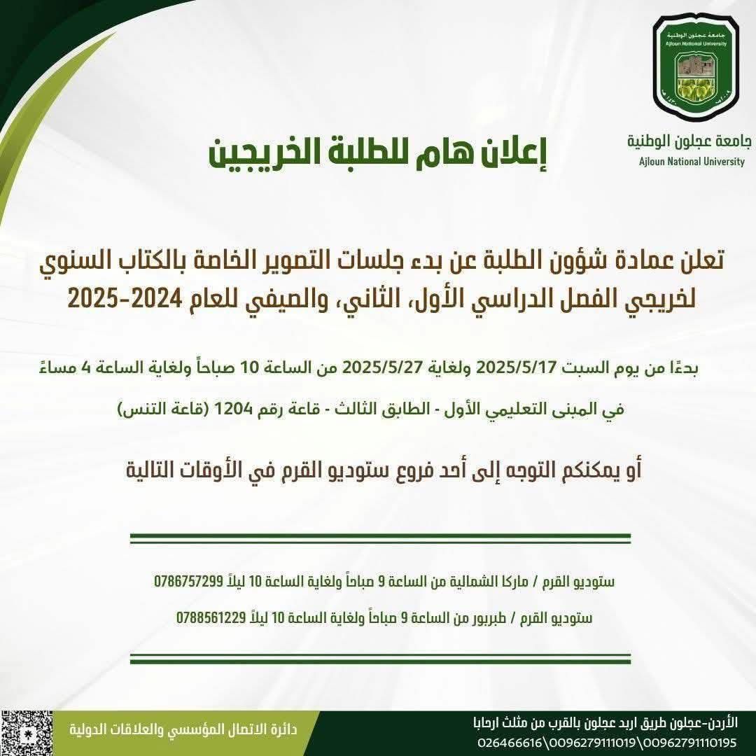 يسر جامعة عجلون الوطنية – عمادة شؤون الطلبة أن تُعلن عن بدء جلسات التصوير الخاصة بالكتاب السنوي، وذلك خلال الفترة: