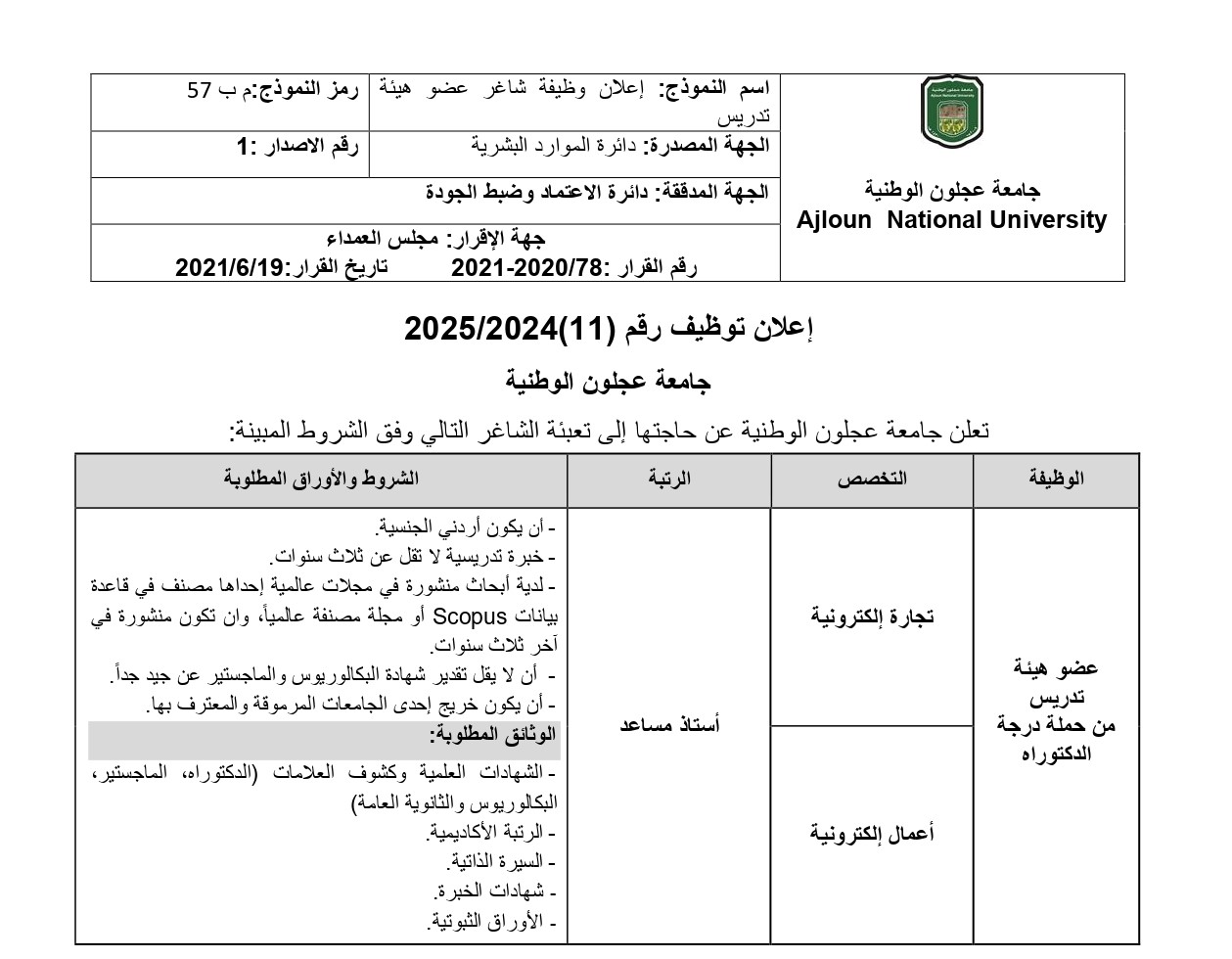 اعلان توظيف /عضو هيئة تدريس من حملة درجة الدكتوراه