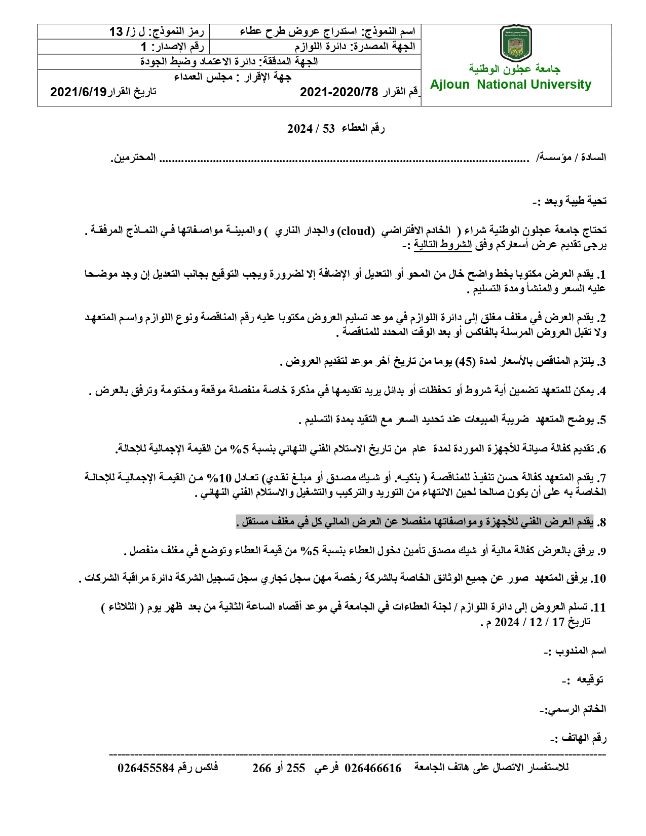 اعلان عطاء /( الخادم الافتراضي (cloud) والجدار الناري
