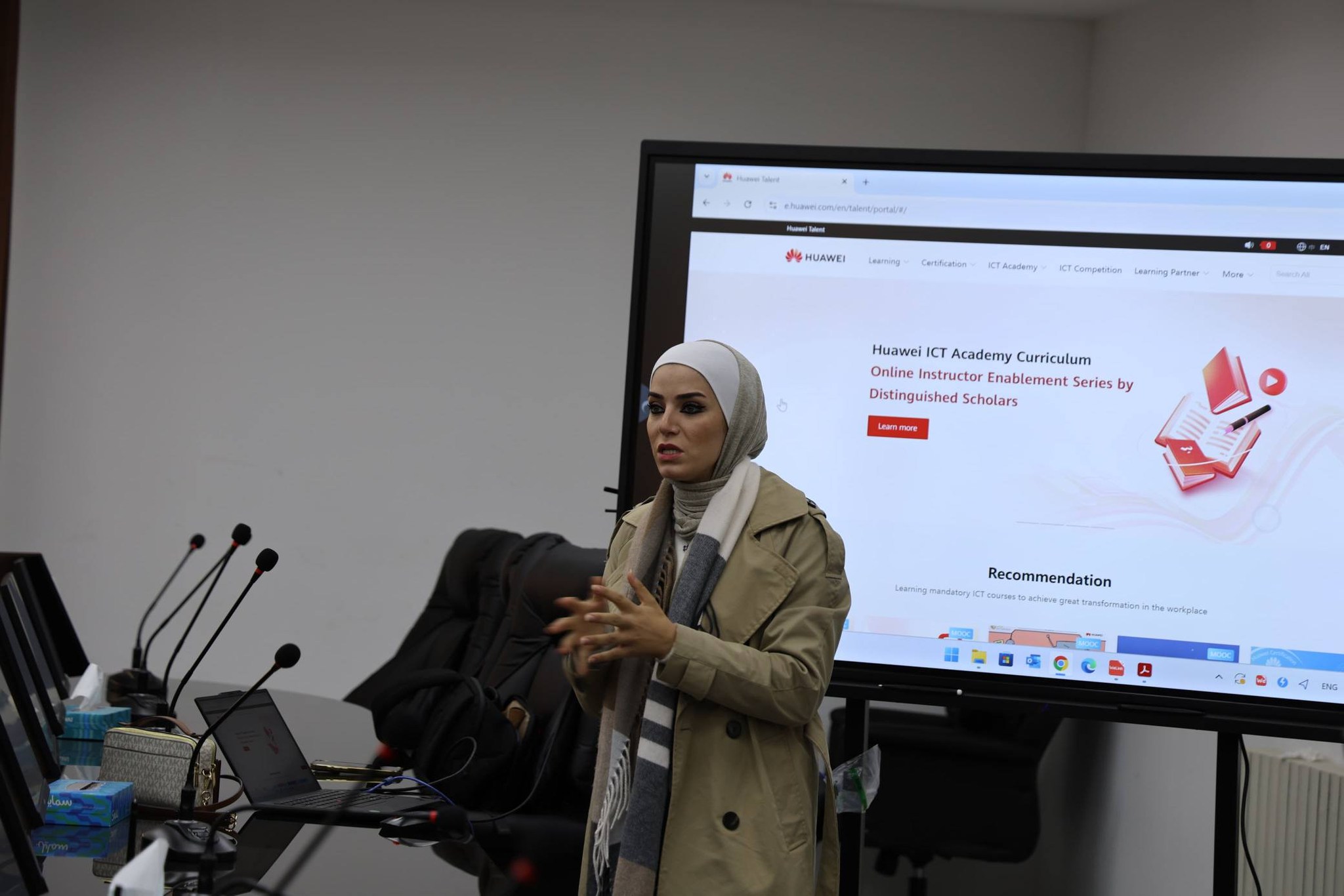 وجاءت هذه الفعالية ضمن توجهات الجامعة لتعزيز الشراكة مع كبرى الشركات العالمية في مجال التكنولوجيا، حيث استعرضت النجار أهداف أكاديمية هواوي وبرامجها التعليمية المعتمدة، وآليات التسجيل فيها، إضافة إلى ما توفره من فرص نوعية تسهم في رفع كفاءة الطلبة وتنمية مهاراتهم التقنية بما يتواءم مع متطلبات سوق العمل.