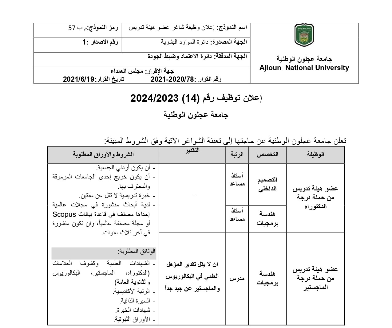 نموذج طلب توظيف عضو هيئة تدريس في جامعة عجلون الوطنية