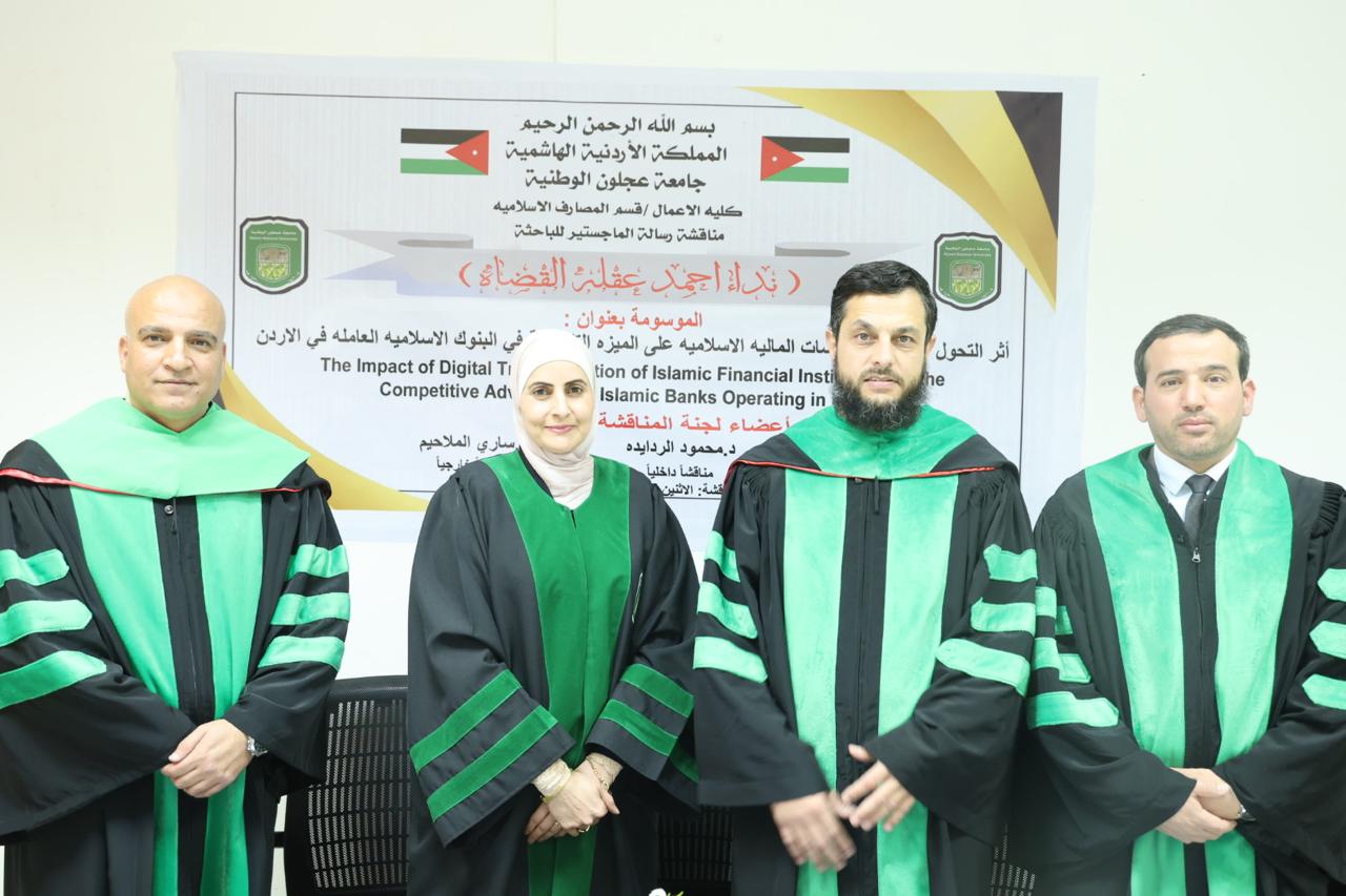 والثانية بعنوان ” أثر التحول الرقمي للمؤسسات المالية الاسلامية على الميزة التنافسية في البنوك الاسلامية العاملة في الاردن” للطالبة نداء أحمد القضاة ، وبإشراف رئيسي للأستاذ الدكتور محي الدين أبو الهول، والدكتور محمود الردايدة مناقشاً داخلياً، والدكتور ساري الملاحيم مناقشاً خارجياً من جامعة البلقاء التطبيقية.
