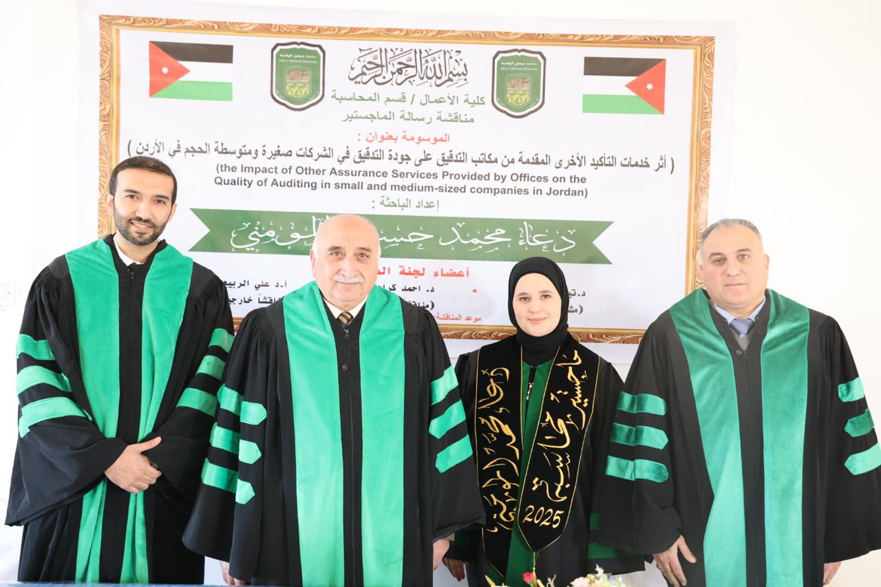 نوقشت اليوم في كلية الأعمال في جامعة عجلون الوطنية رسالتي ماجستير الأولى قسم المحاسبة بعنوان “أثر خدمات التأكيد الأخرى المقدمة من مكاتب التدقيق على جودة التدقيق في الشركات صغيرة ومتوسطة الحجم في الأردن”، للطالبة دعاء محمد المومني، وبإشراف رئيسي للدكتور تيسير المومني، والدكتورأحمد كراجة مناقشاً داخلياً، والأستاذ الدكتور علي الربيع مناقشاً خارجياً من جامعة جدارا.