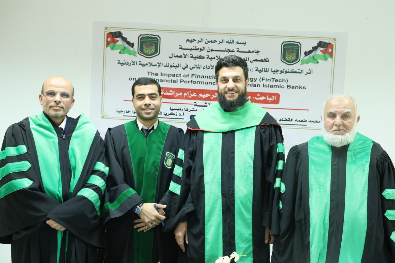 والثانية قسم المصارف الاسلامية بعنوان ”أثرالتكنولوجيا المالية ( Fin Tech) على الاداء المالي في البنوك الاسلامية الاردنية” للطالب محمد عبد الرحيم مراشدة، وبإشراف رئيسي للأستاذ الدكتور محي الدين أبو الهول ، والدكتور محمد طعمة مناقشاً داخلياً، والأستاذ الدكتور زكريا شطناوي مناقشاً خارجياً من جامعة اليرموك