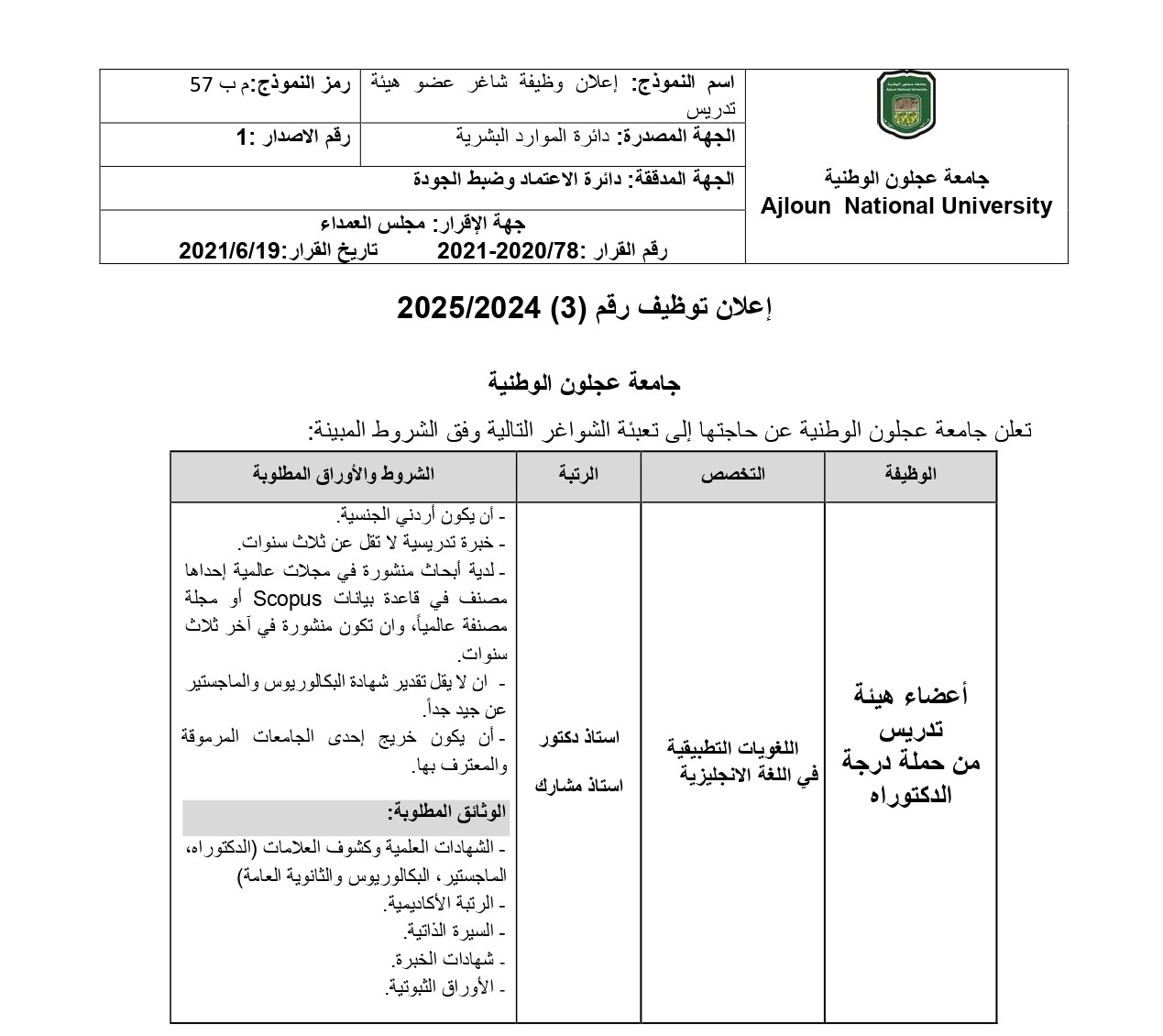 ** لن يتم قبول أي طلب في حالة عدم اكتمال الشروط والوثائق المطلوبة، وانتهاء فترة الإعلان.