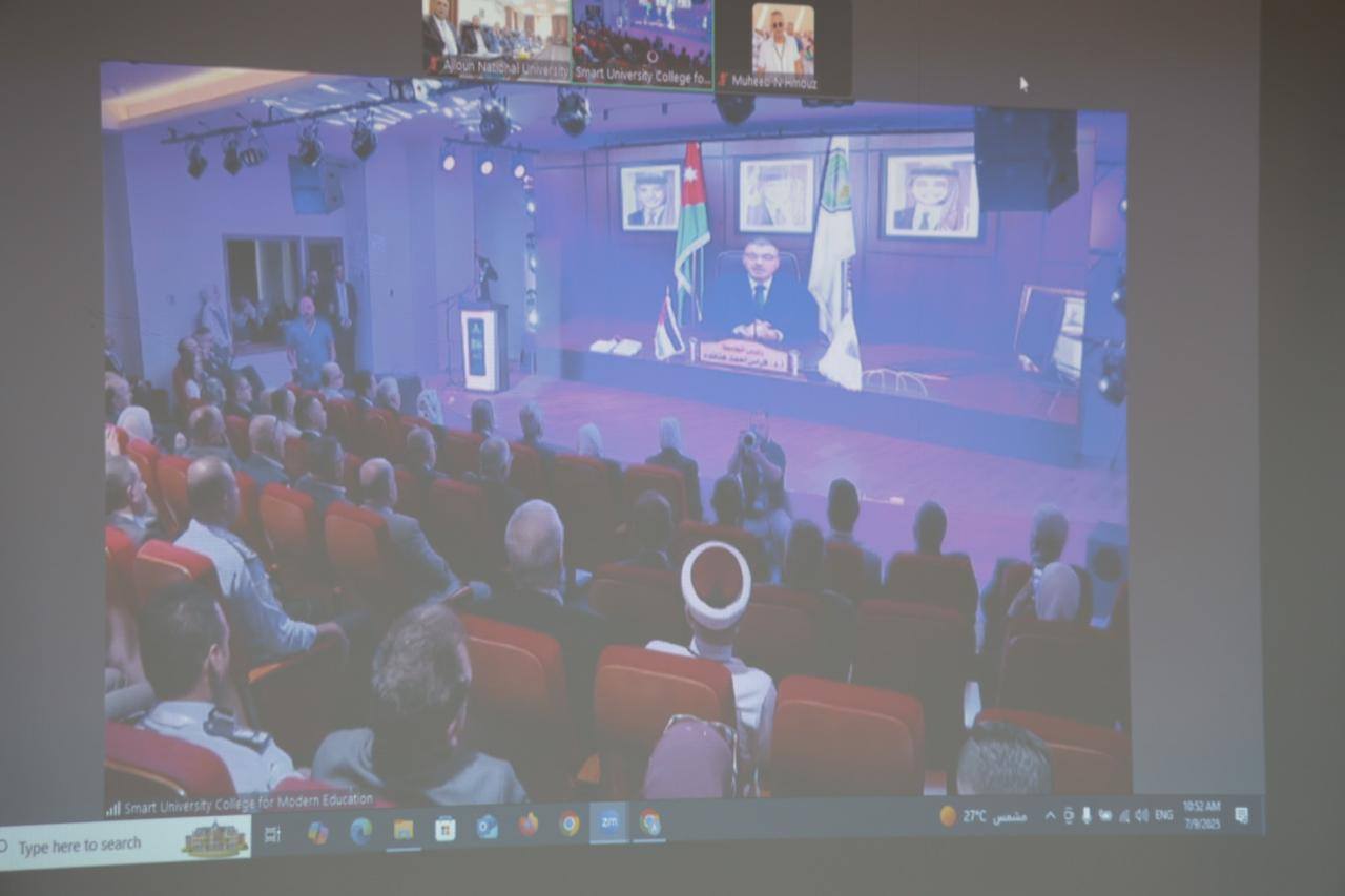 جانب من حضور رئيس جامعة عجلون الوطنية الأستاذ الدكتور فراس الهناندة، والسادة عمداء الكليات، وعدد من أعضاء الهيئة التدريسية، عبر تقنية الاتصال المرئي، لفعاليات المؤتمر الدولي للتعليم الذكي IEEE SCME 2025، الذي عُقد في الكلية الذكية الجامعية بمدينة الخليل – فلسطين، صباح اليوم 9 تموز 2025، وذلك تأكيدًا على دور الجامعة الريادي في دعم التحول الرقمي والابتكار في التعليم وتعزيز الشراكات الأكاديمية الدولية.