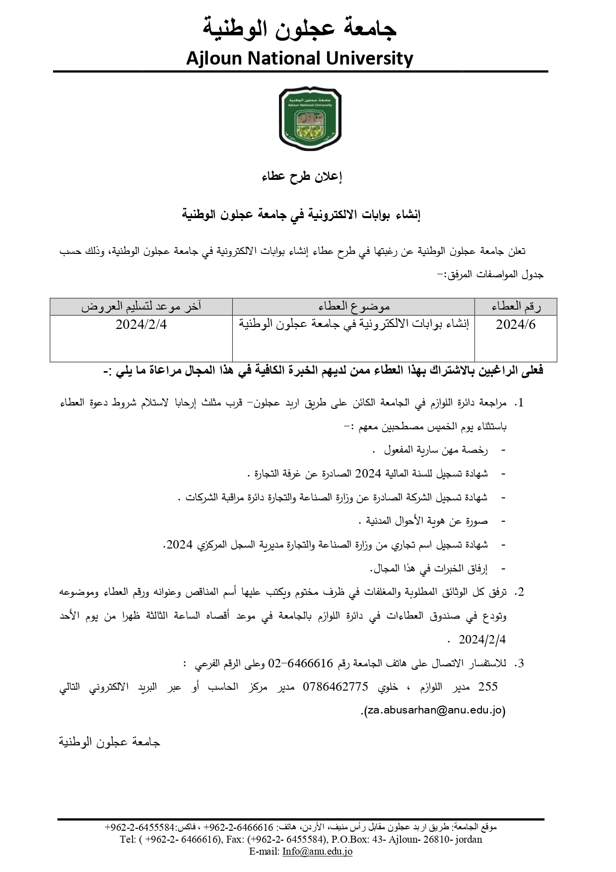 اعلان عطاء /إنشاء البوابات الالكترونية في جامعة عجلون الوطنية
