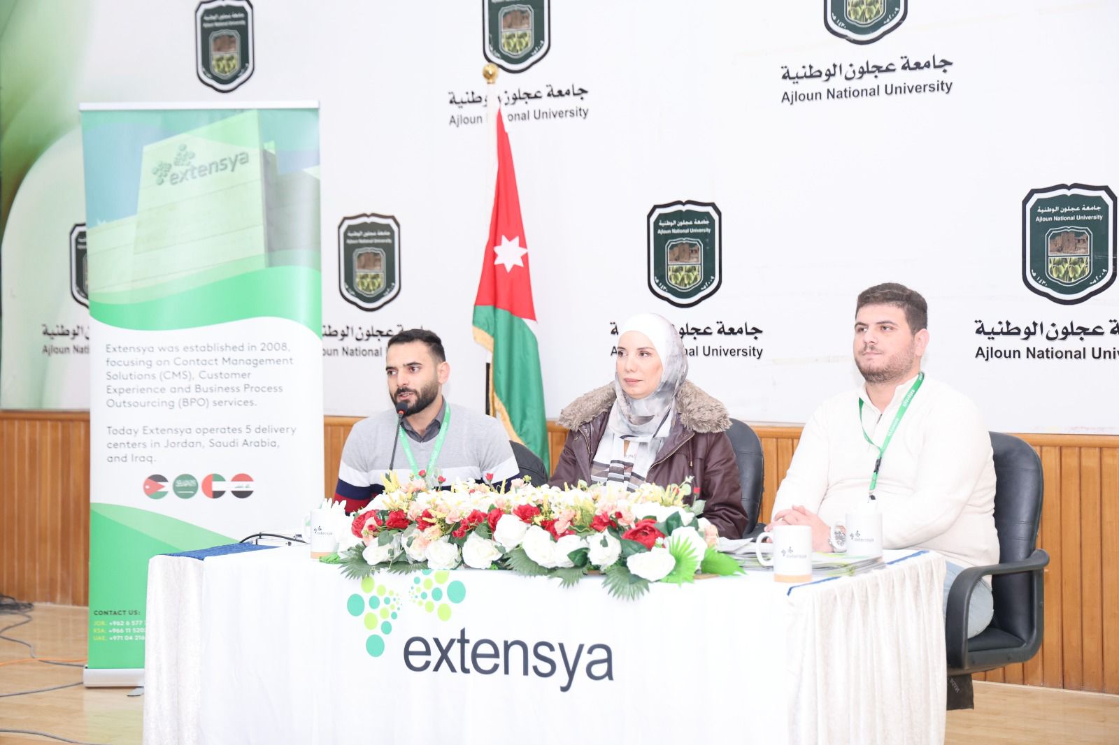 ظم مكتب الإرشاد الوظيفي ومتابعة الخريجين/عمادة شؤون الطلبة يوم توظيفي لطلبتها وخريجيها بمشاركة شركة اكستنسيا بحضور عميد شؤون الطلبة الدكتورة ريم الكناني ومدير مكتب الإرشاد الوظيفي جمانة أبوبكر وعدد من أعضاء الهيئتين التدريسية والإدارية في مدرج عز الدين اسامة.