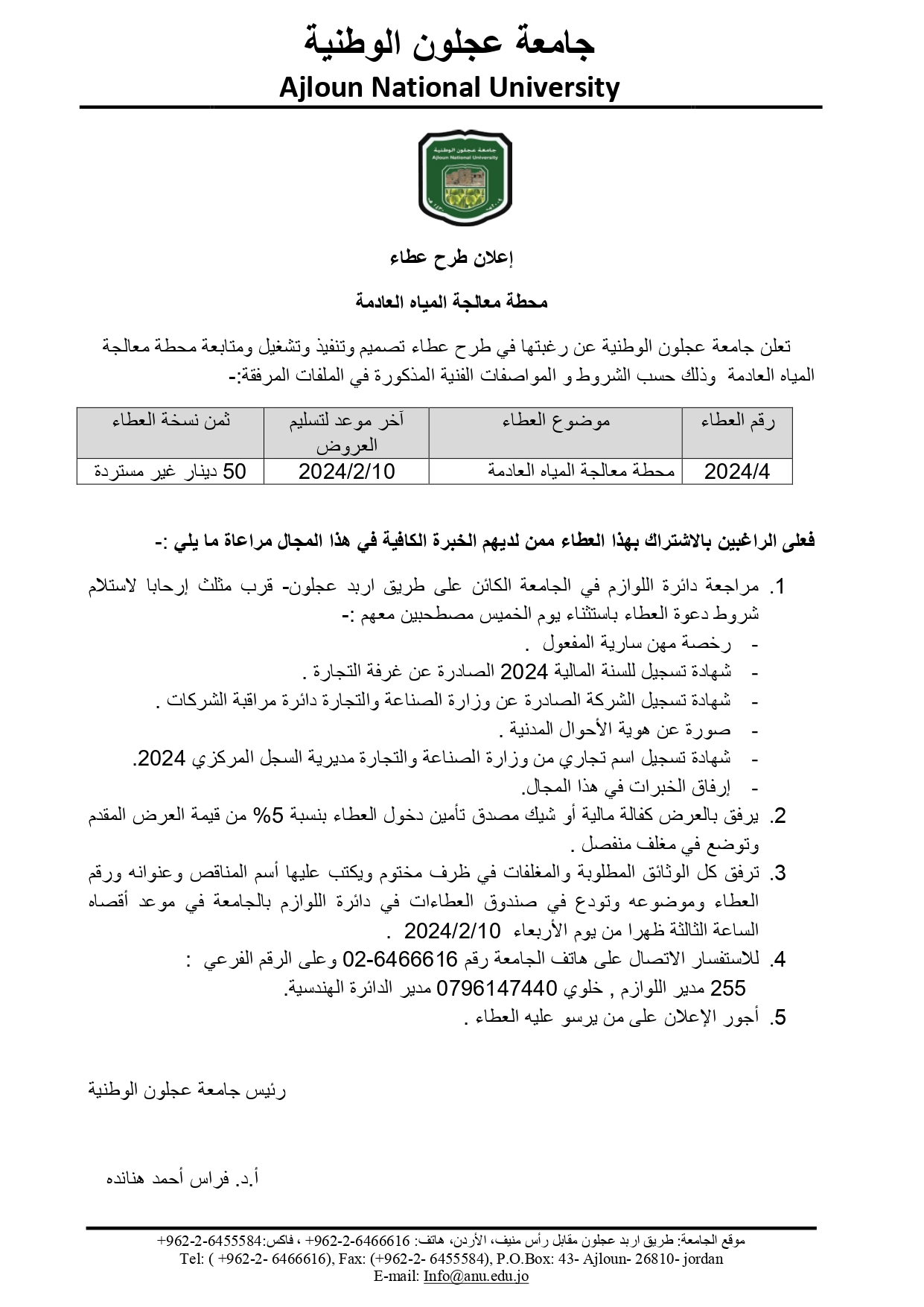 اعلان طرح عطاء /محطة معالجة المياه العادمة